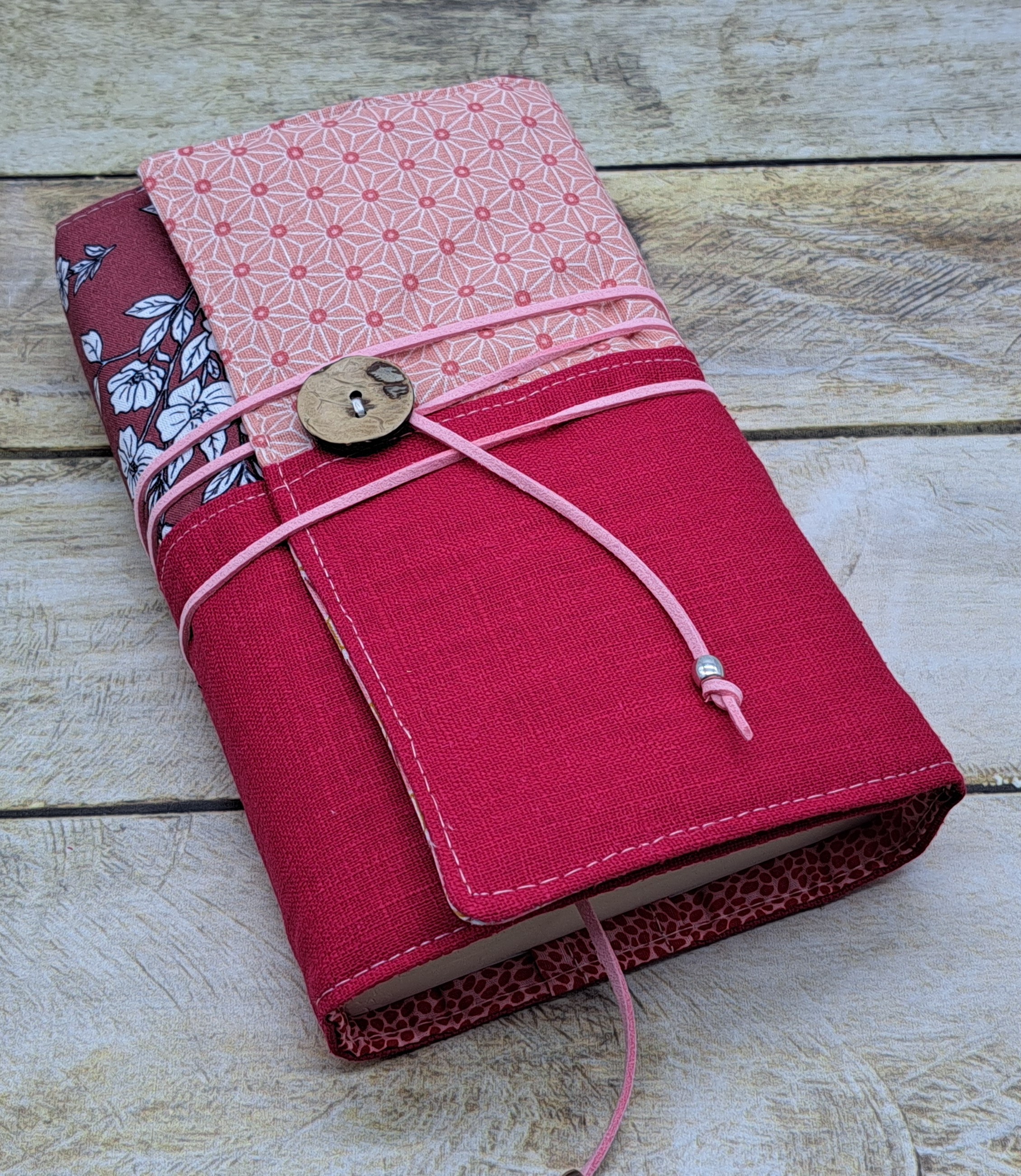 Protège livre en tissus coton patchwork se fermant avec un crochet / bouton et un cordon.