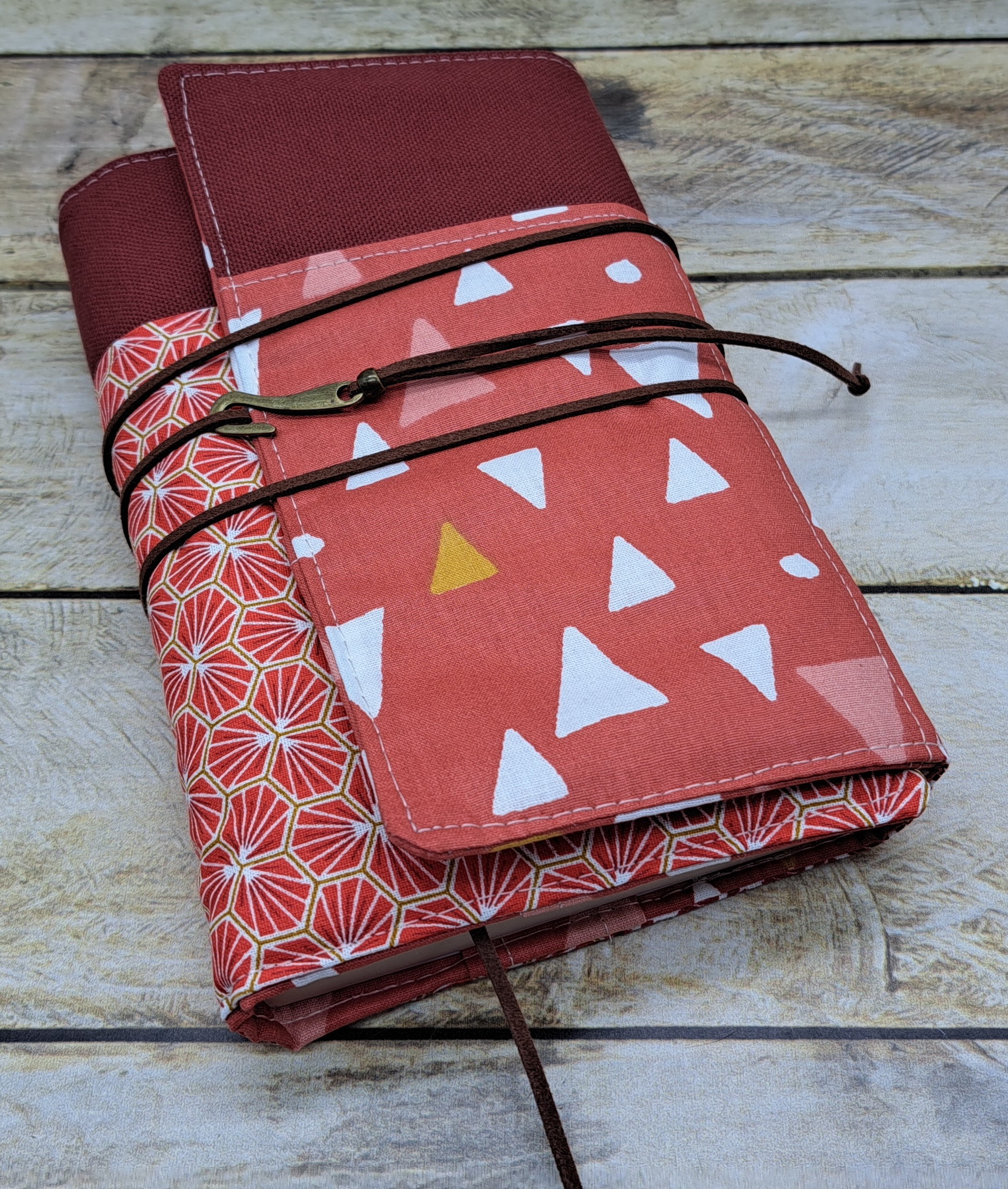 Protège livre en tissus coton patchwork se fermant avec un crochet / bouton et un cordon.
