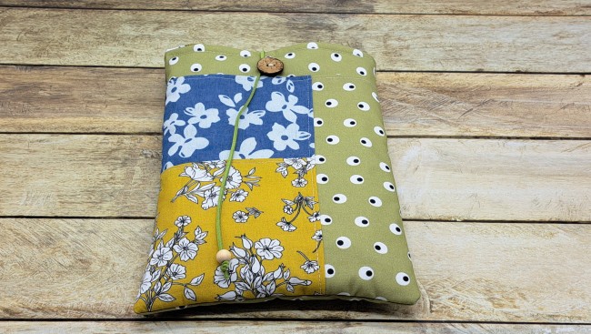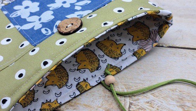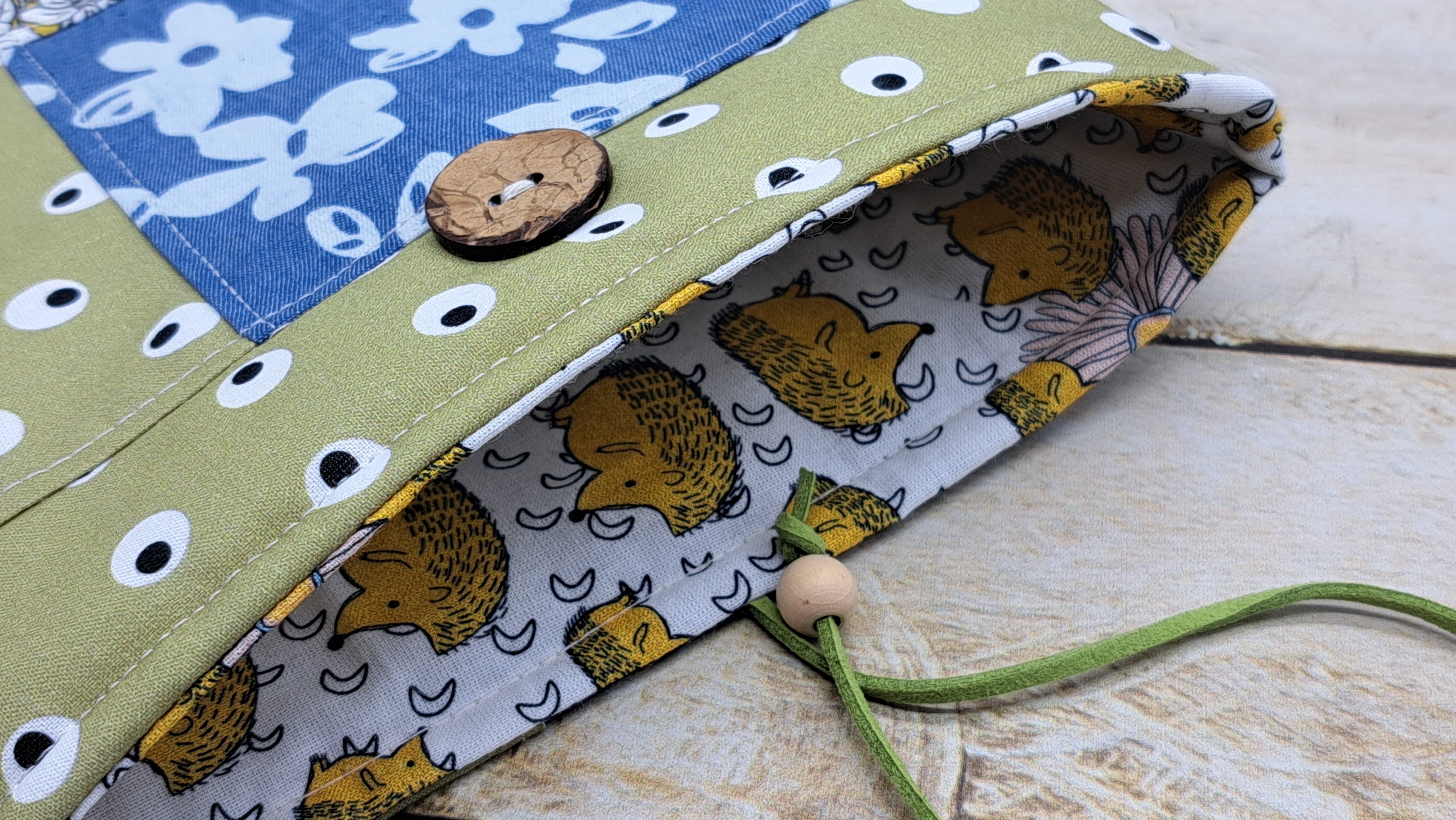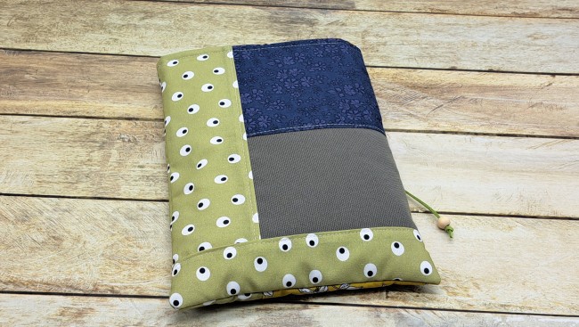 Housse de protection pour livre en tissu coton patchwork molletonné se fermant avec un bouton et un cordon