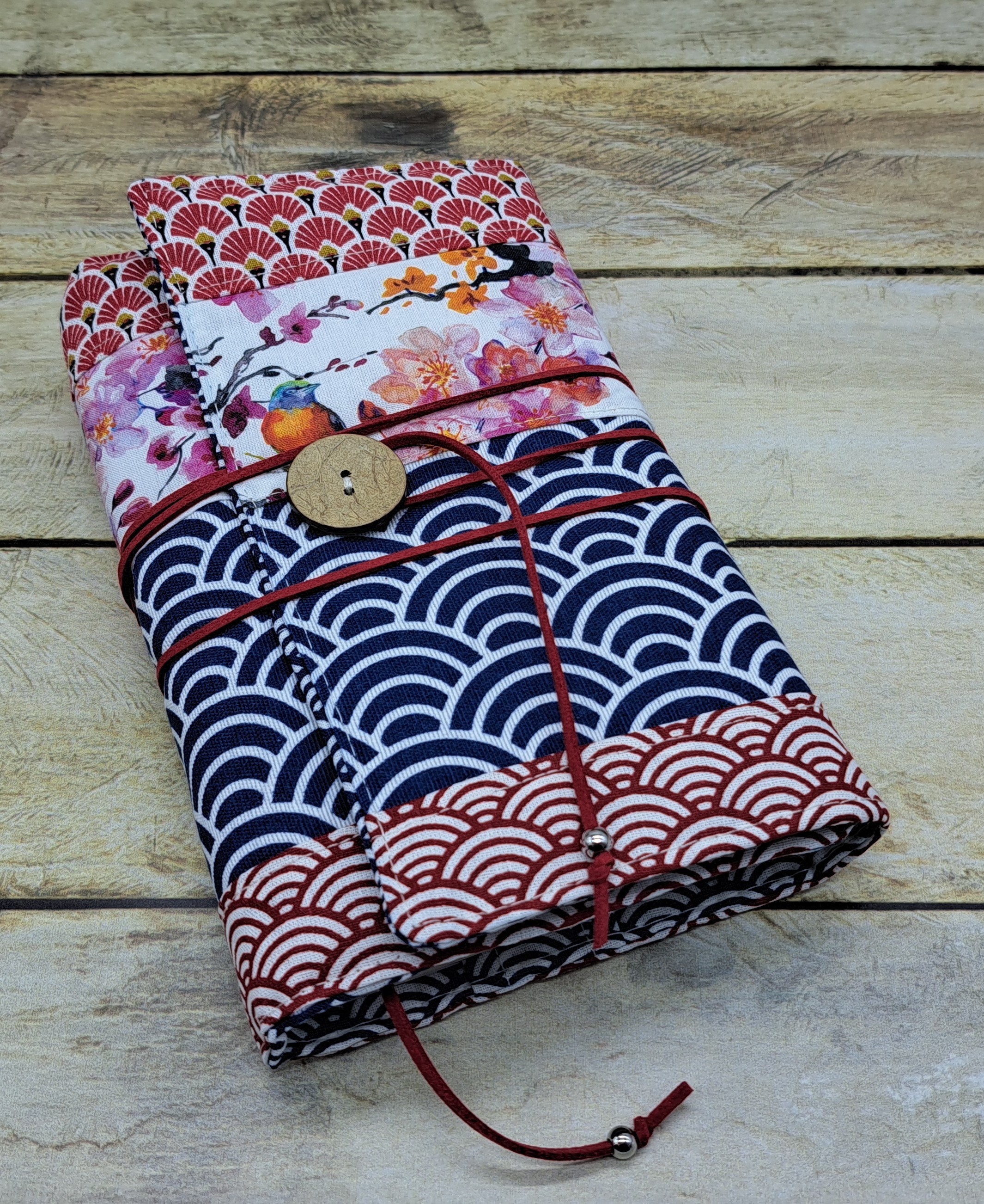 Protège livre en tissus coton patchwork se fermant avec un crochet / bouton et un cordon.