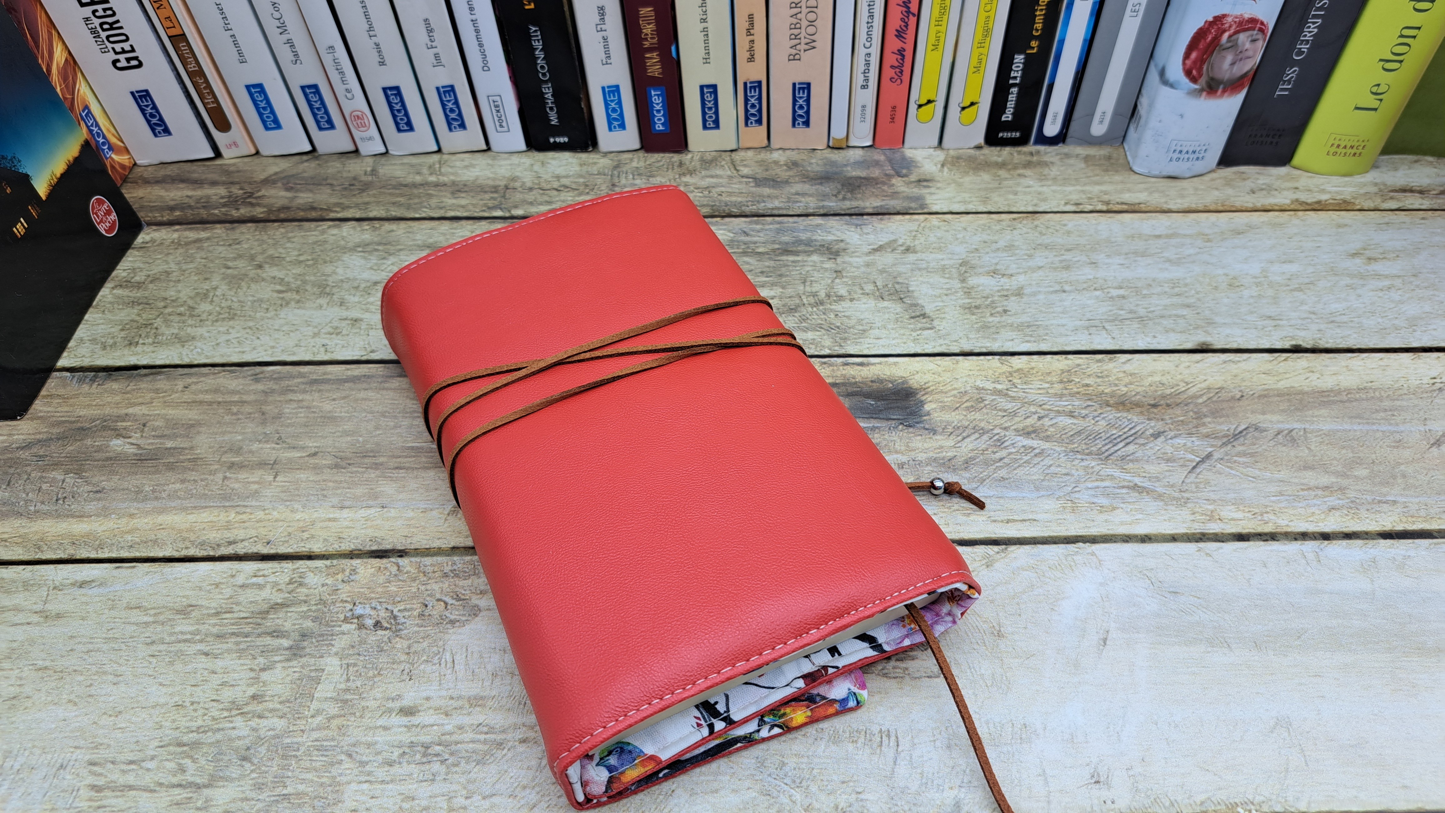 Protège livre en tissus simili cuir et coton se fermant avec un bouton et un cordon.