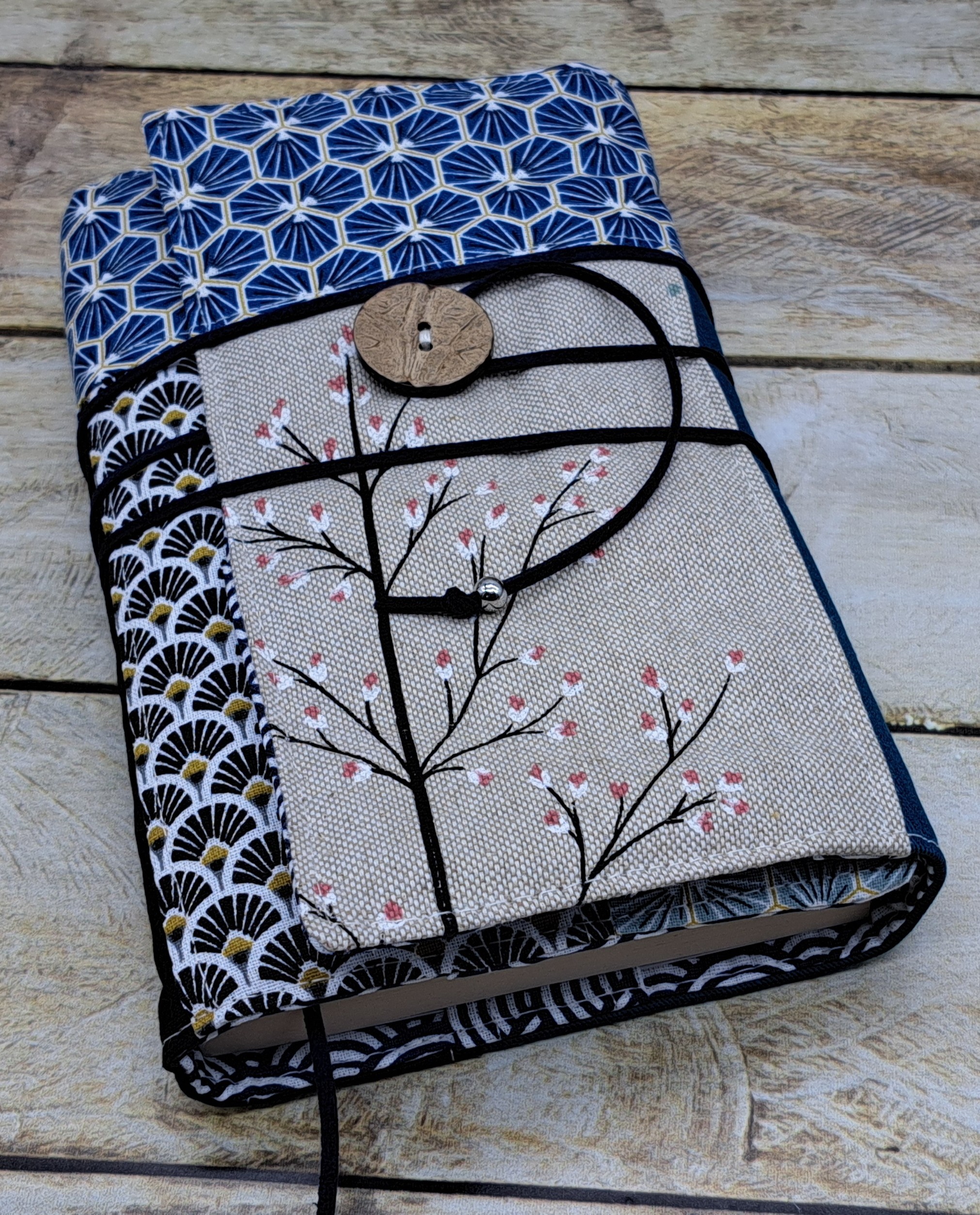 Protège livre en tissus coton patchwork se fermant avec un crochet / bouton et un cordon.