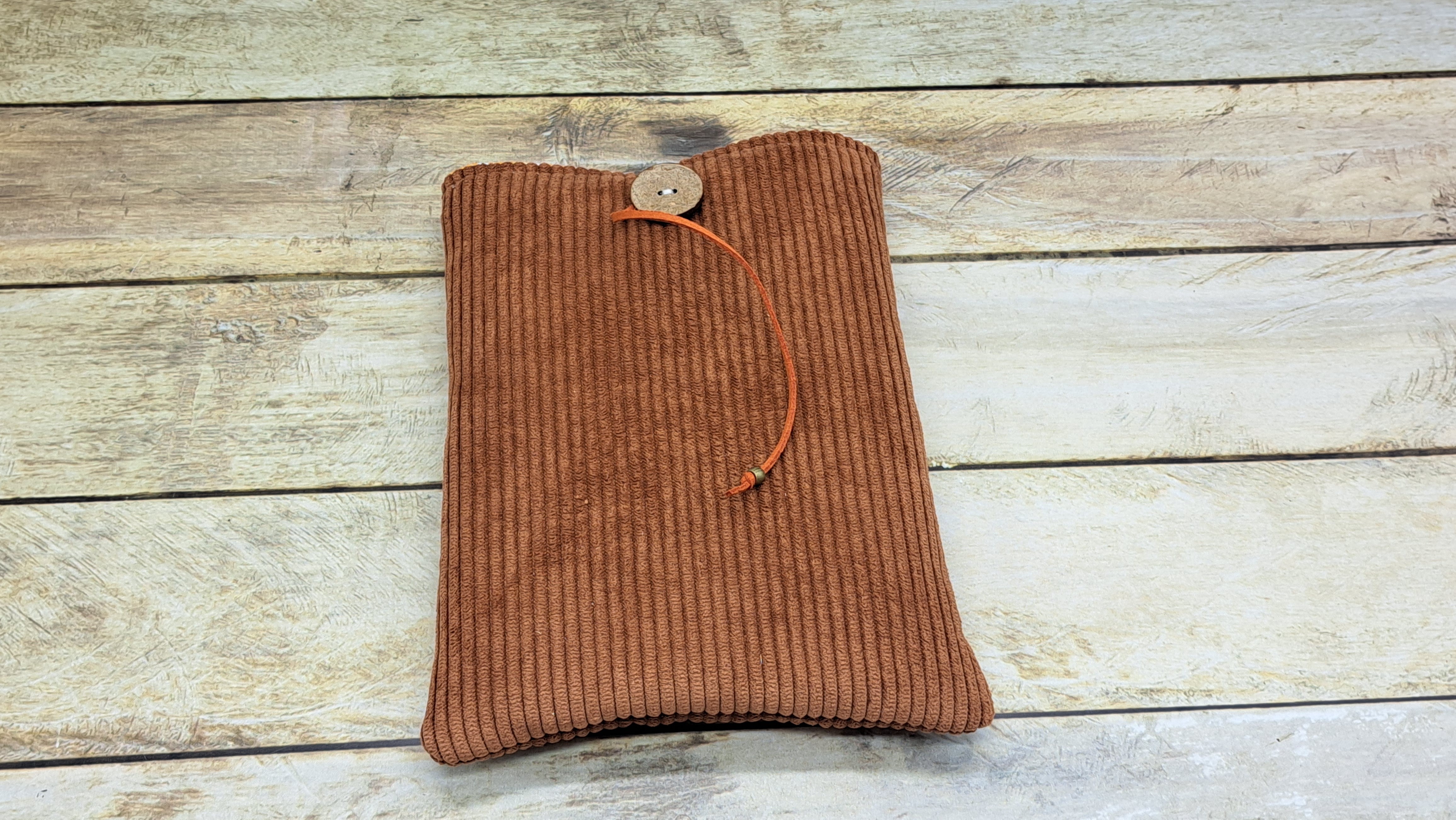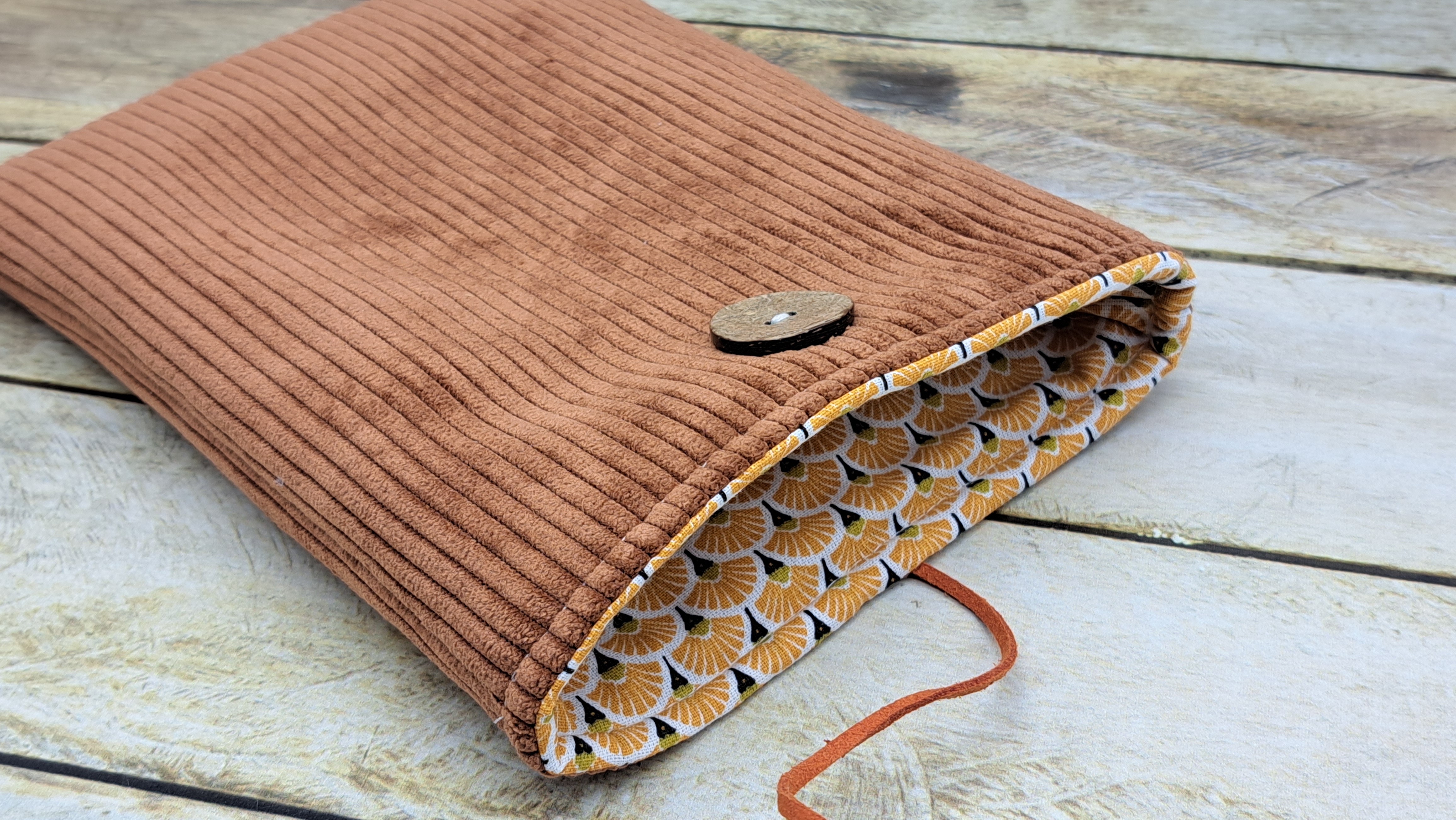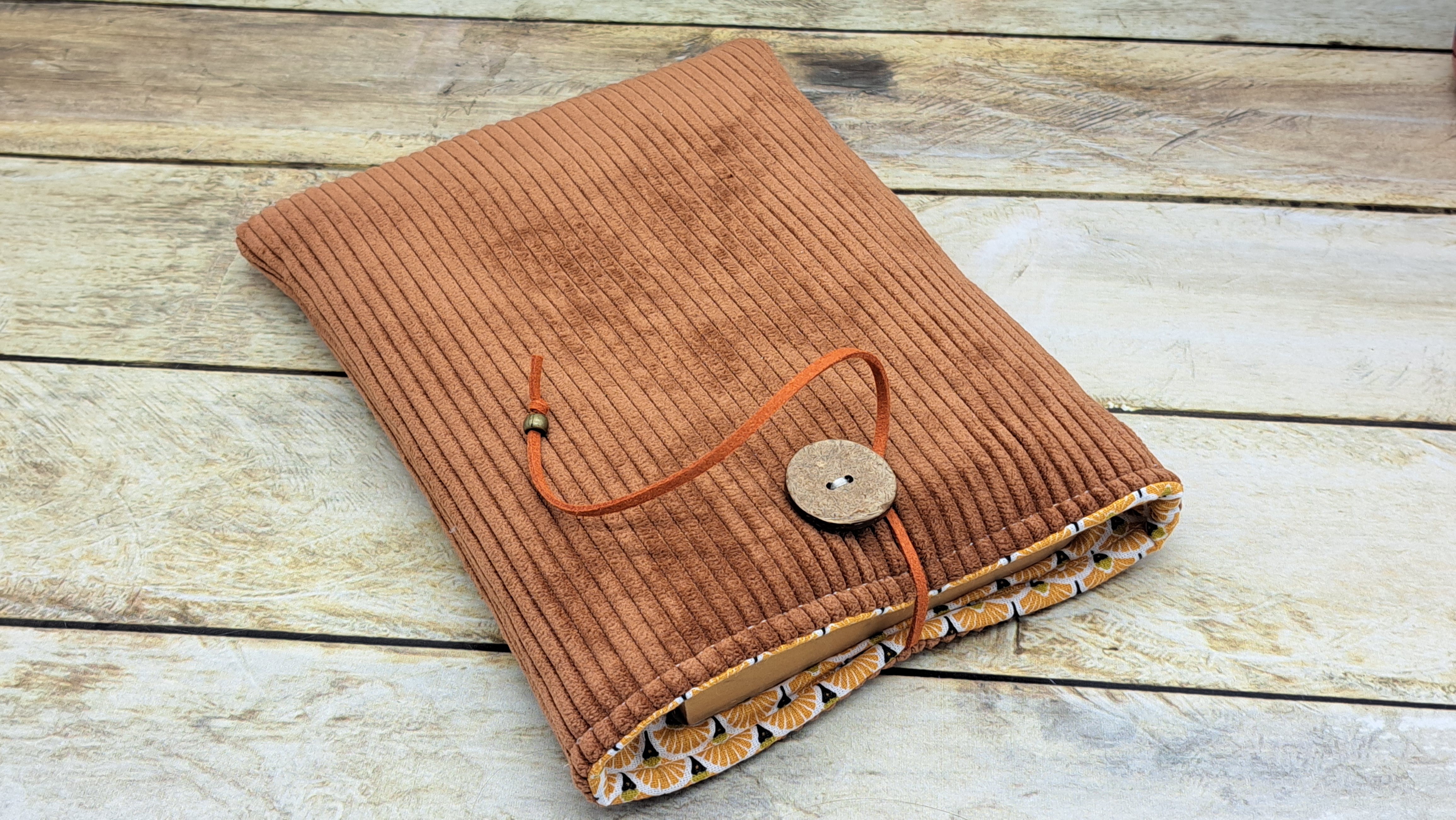 Housse de protection pour livre en tissu coton molletonné se fermant avec un bouton et un cordon