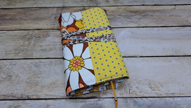 Protège livre en tissus coton patchwork se fermant avec un crochet / bouton et un cordon.