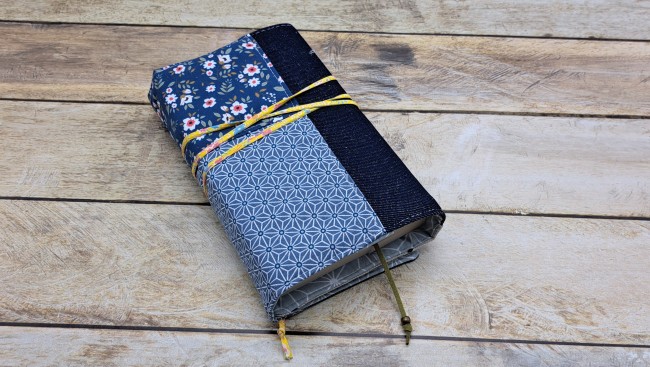 Protège livre en tissus coton patchwork se fermant avec un crochet / bouton et un cordon.