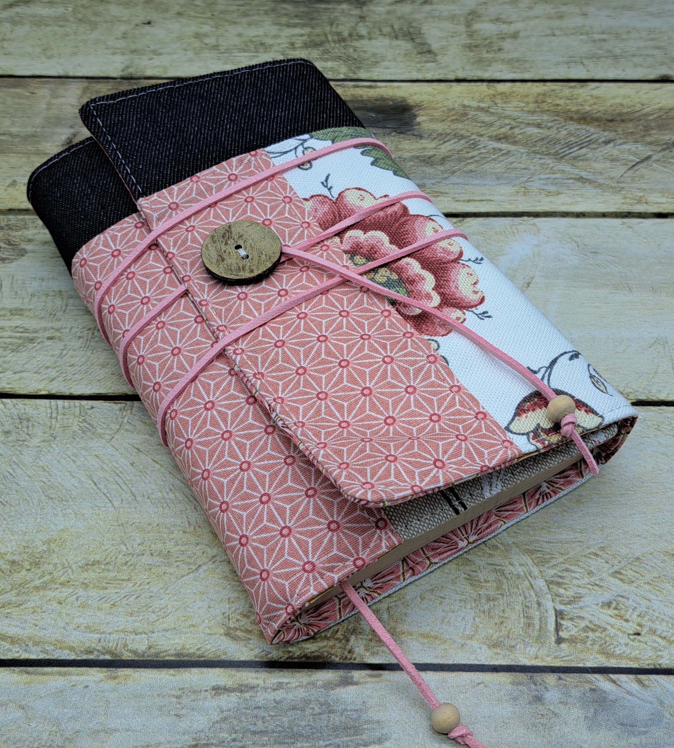 Protège livre en tissus coton patchwork se fermant avec un crochet / bouton et un cordon.