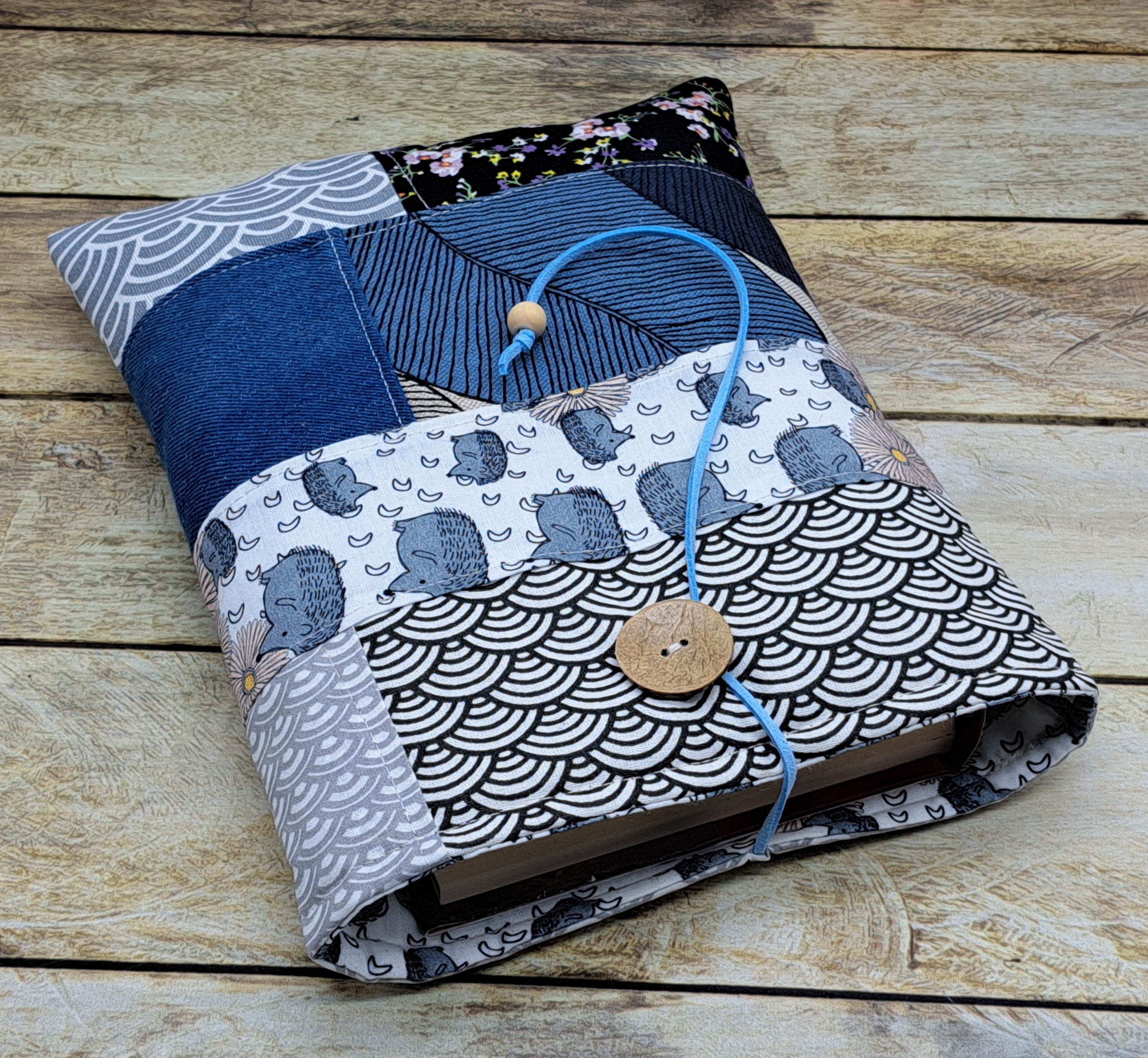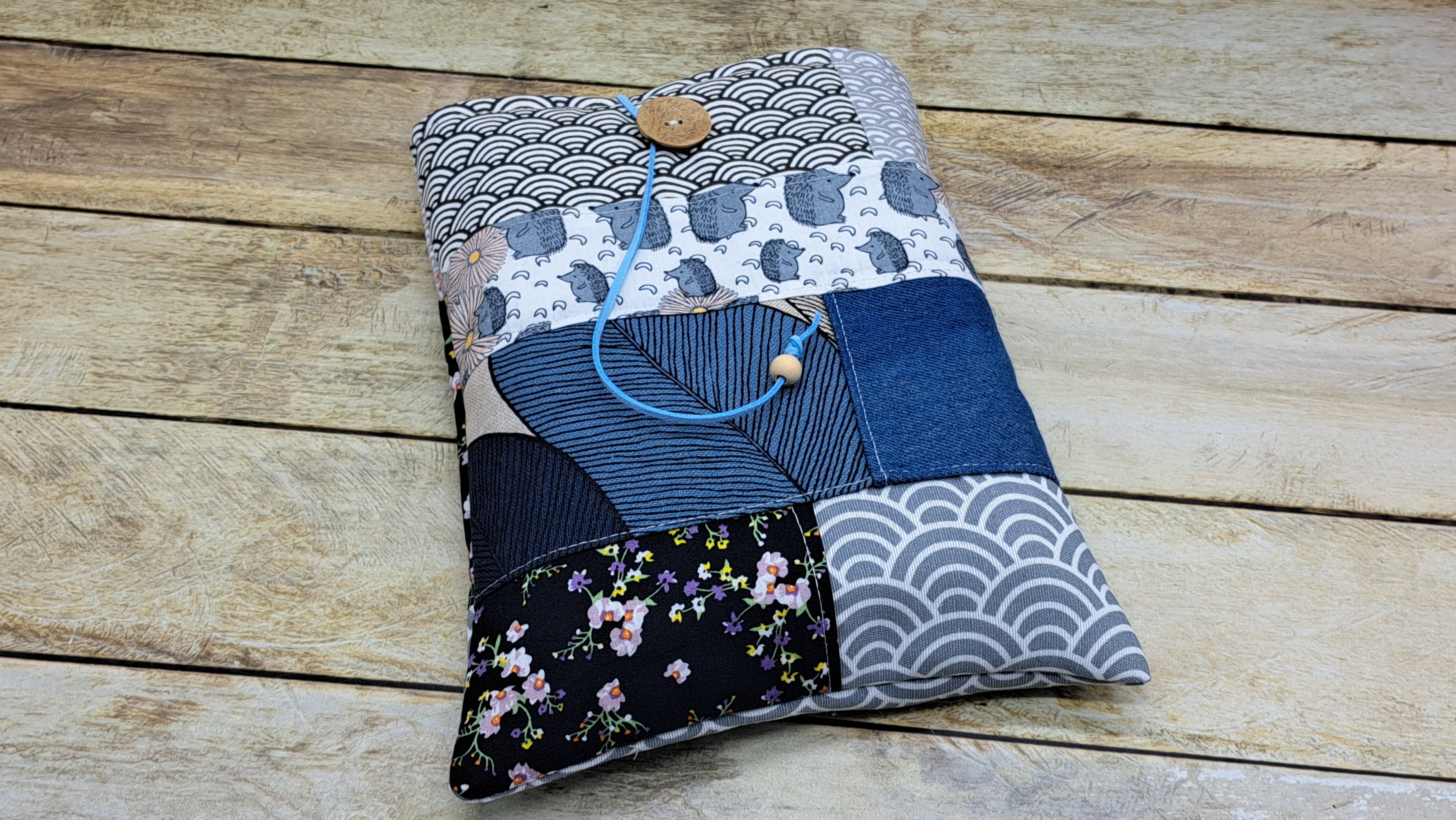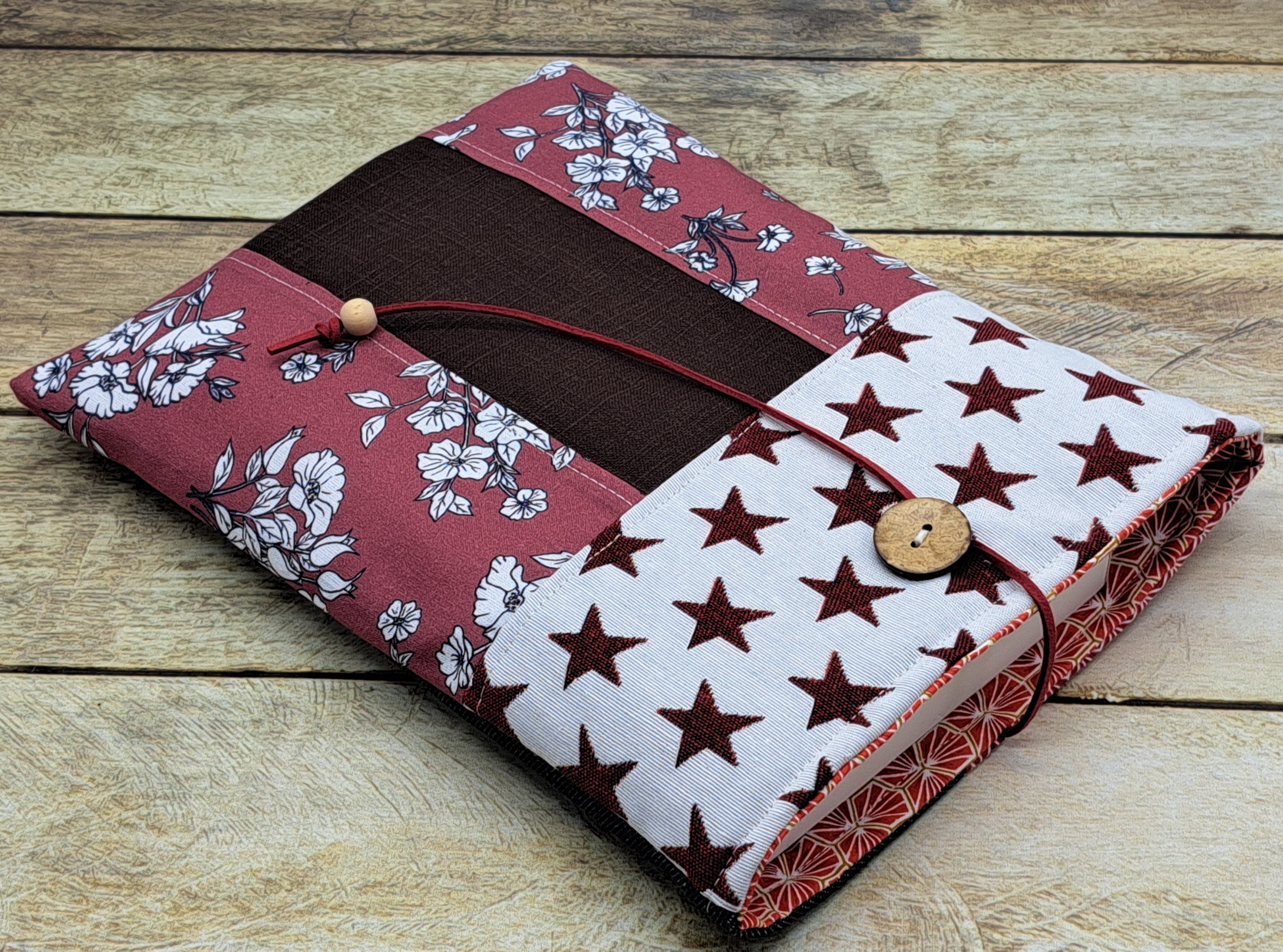 Housse de protection pour livre en tissu coton patchwork molletonné se fermant avec un bouton et un cordon