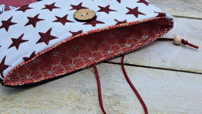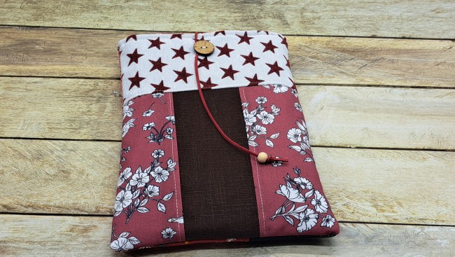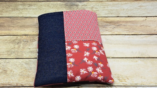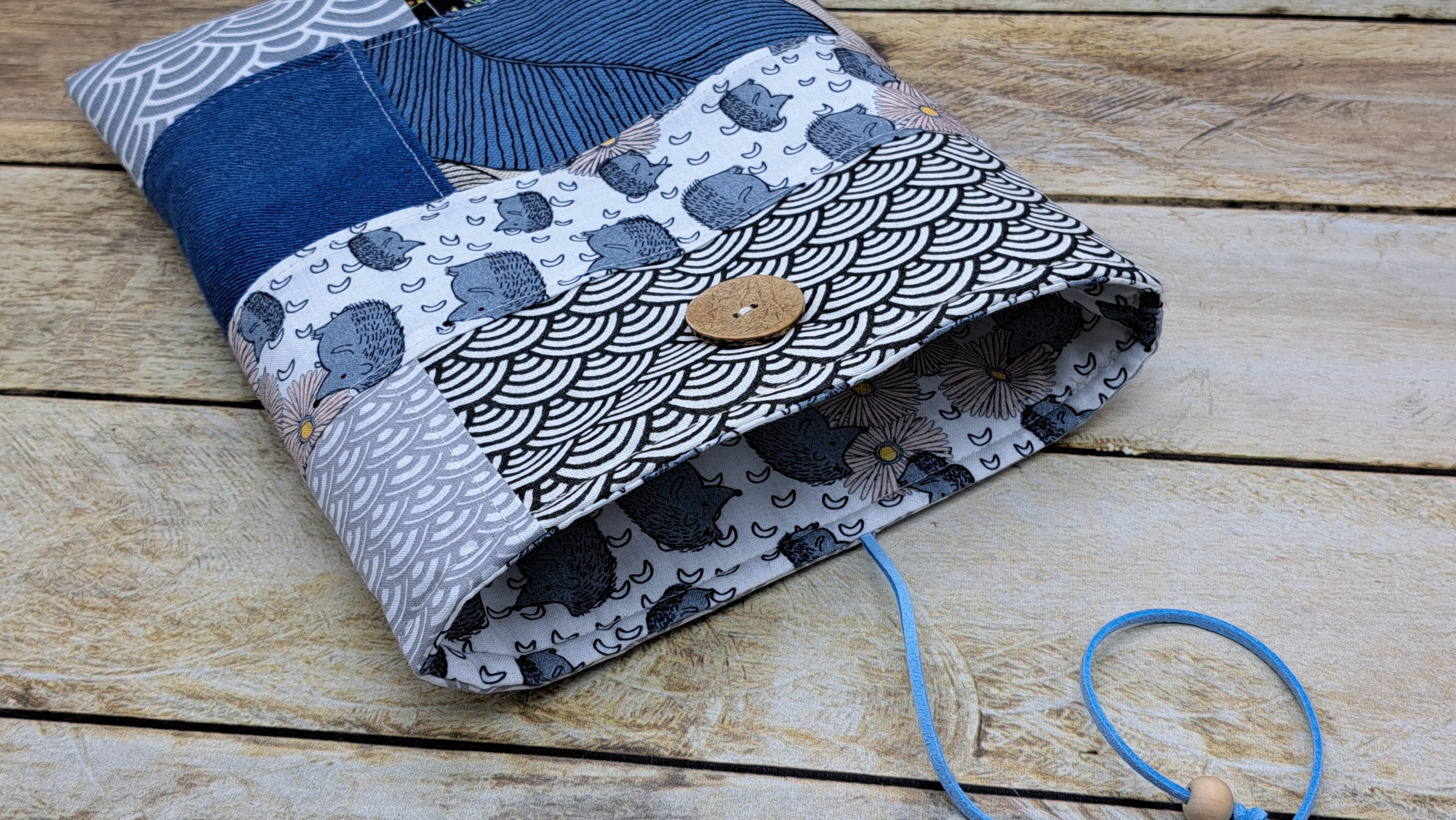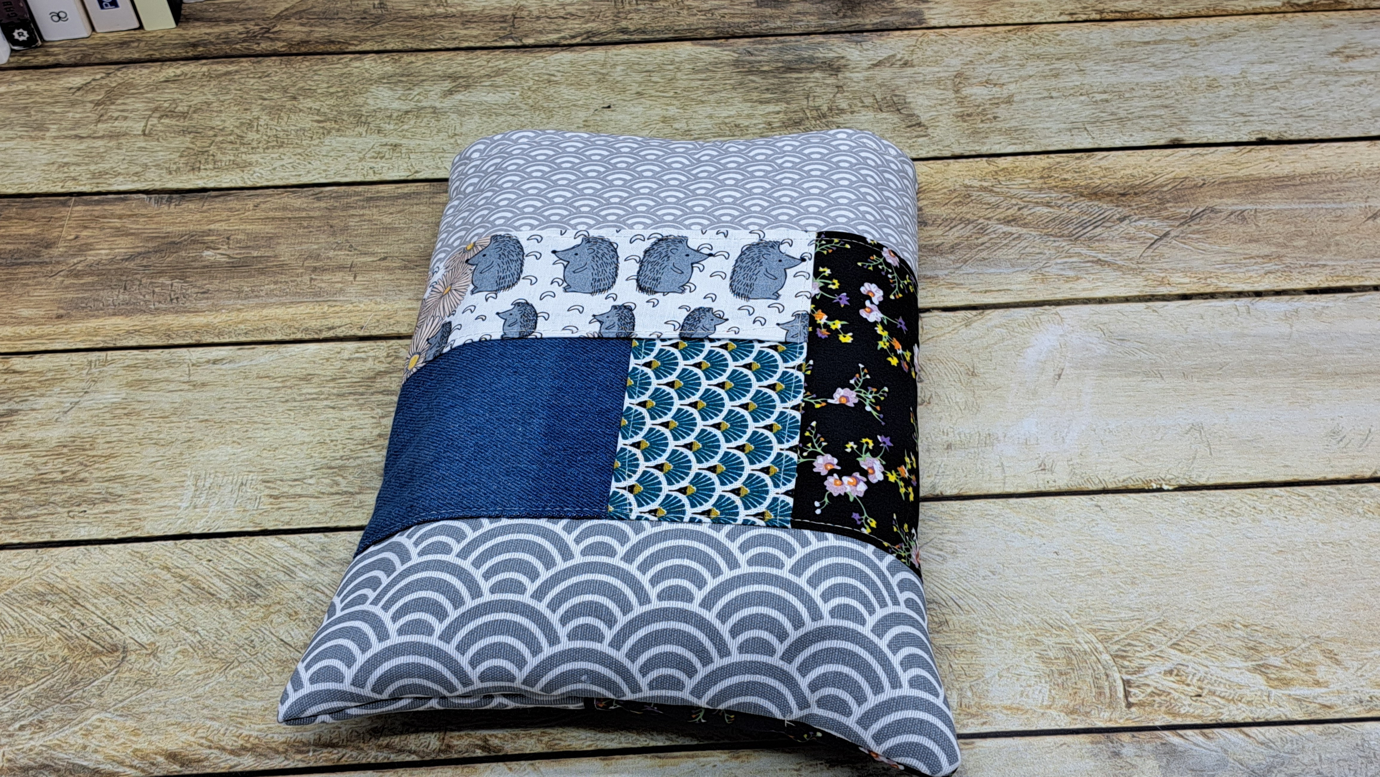 Housse de protection pour livre en tissu coton patchwork molletonné se fermant avec un bouton et un cordon