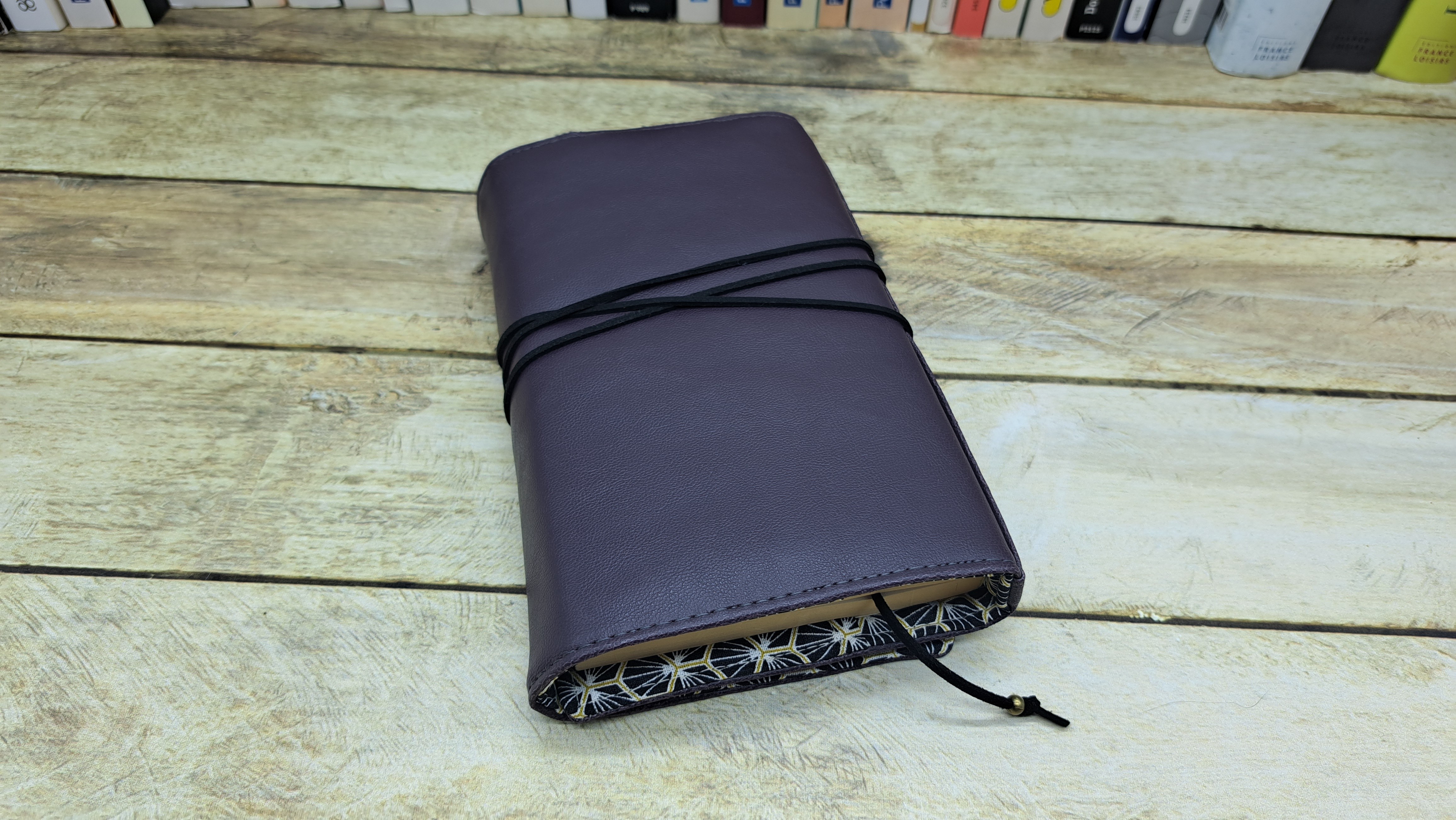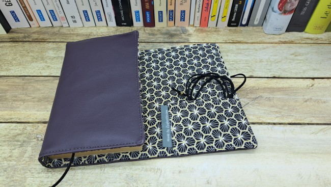 Protège livre en tissus simili cuir et coton se fermant avec un bouton et un cordon.