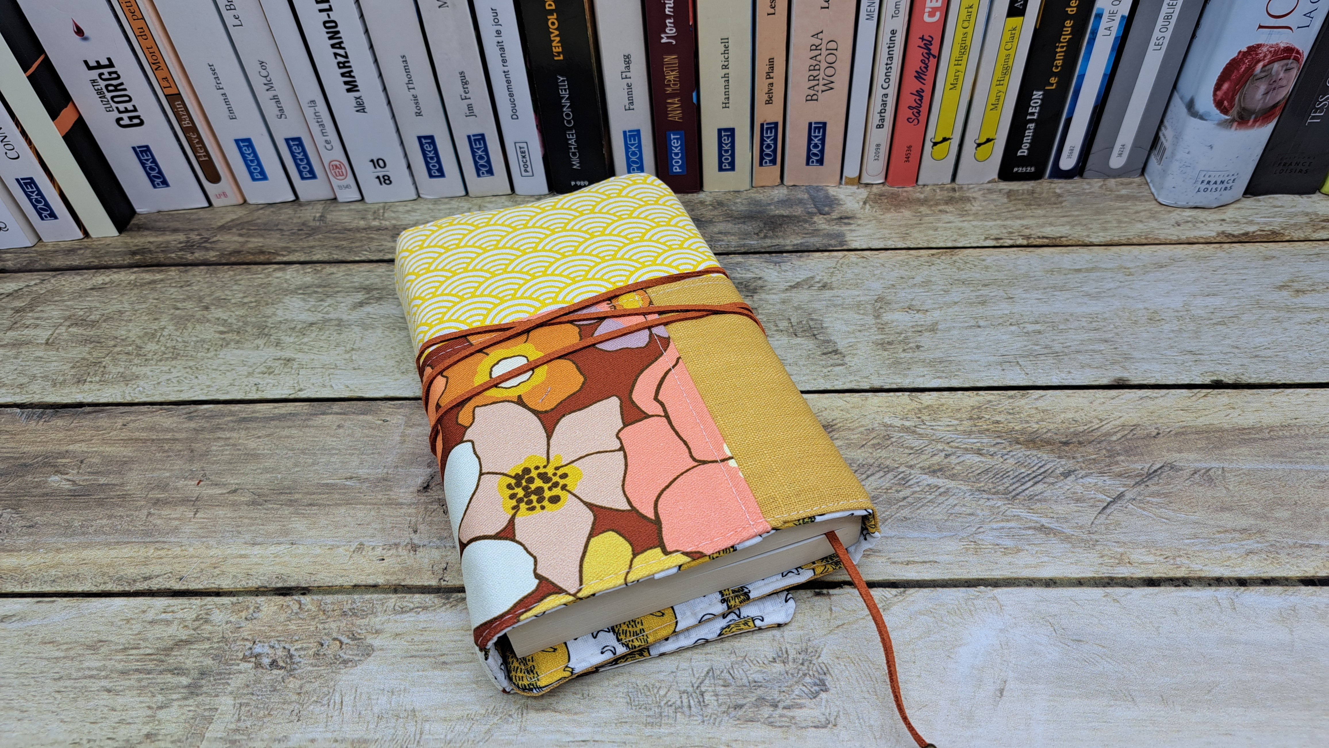 Protège livre en tissus coton patchwork se fermant avec un crochet / bouton et un cordon.