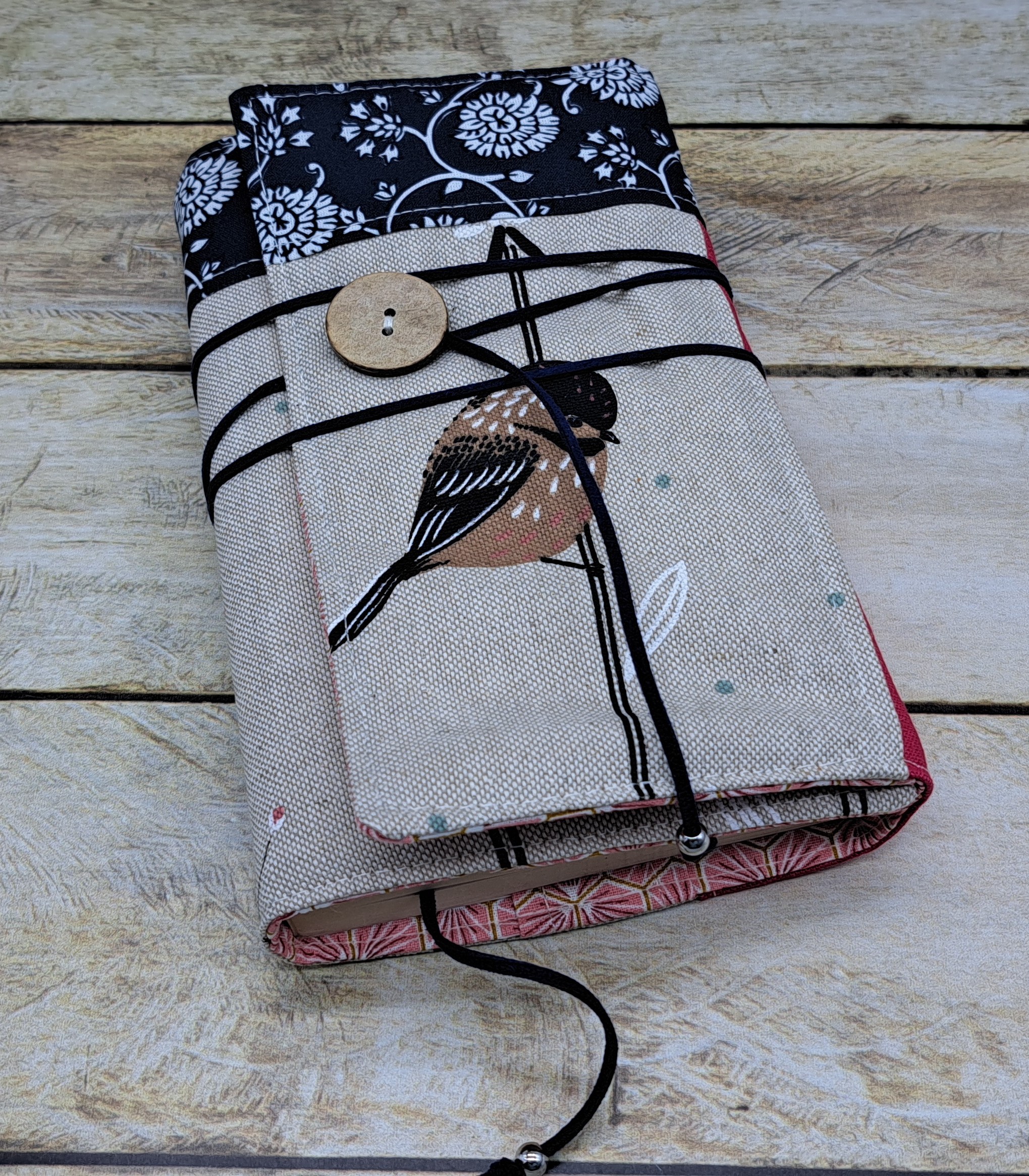 Protège livre en tissus coton patchwork se fermant avec un crochet / bouton et un cordon.