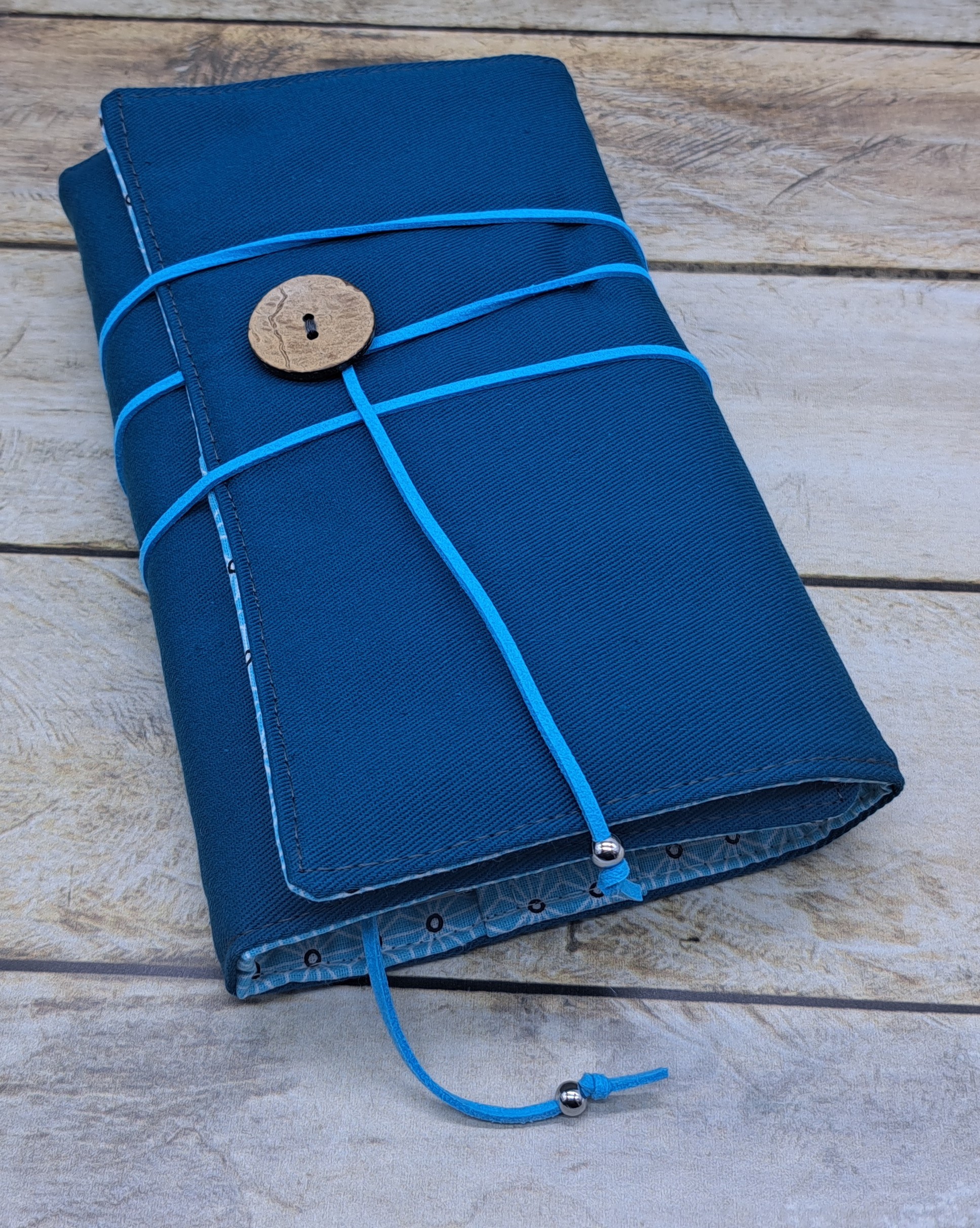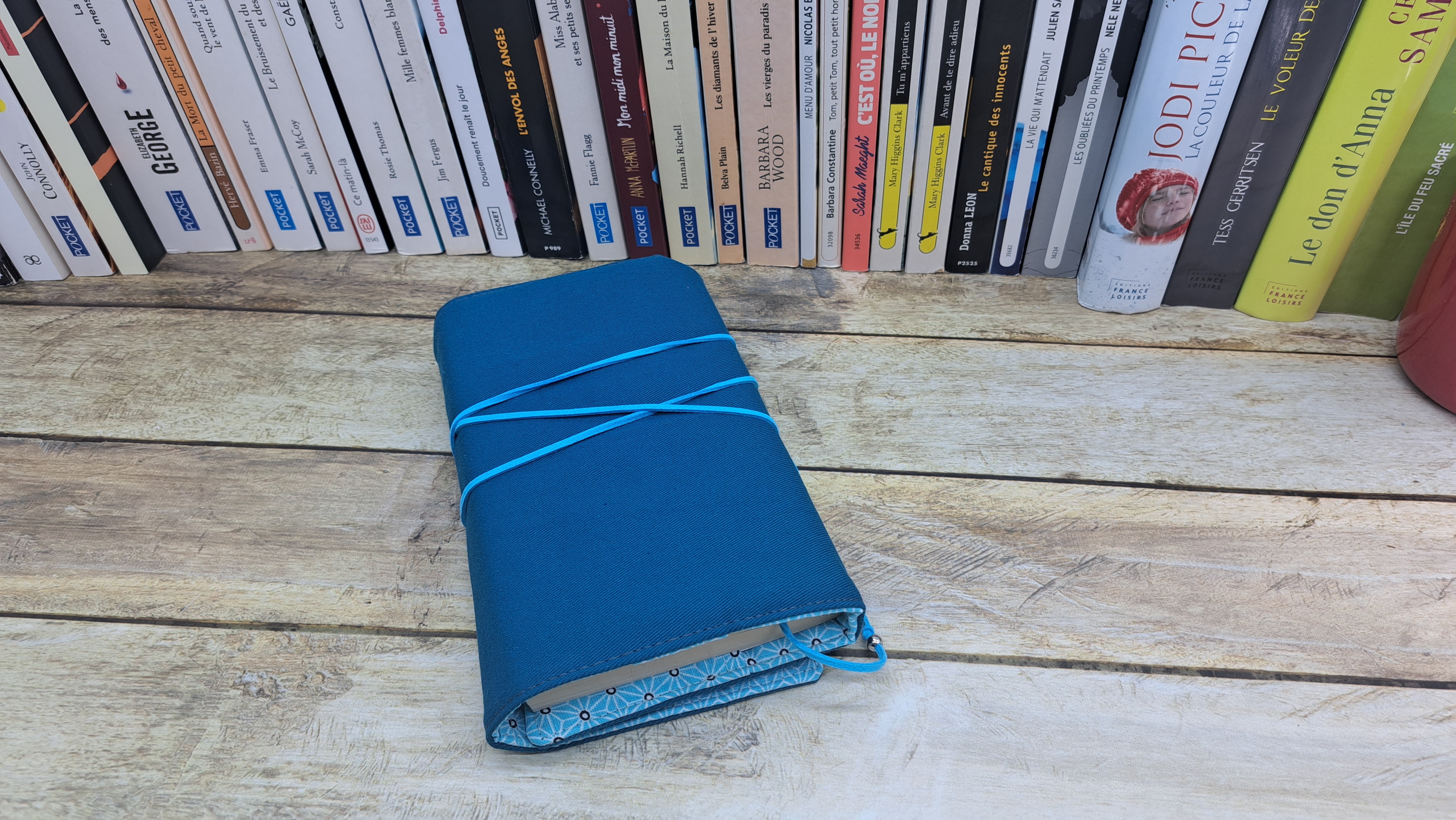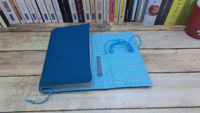 Protège livre en tissus coton se fermant avec un bouton et un cordon.