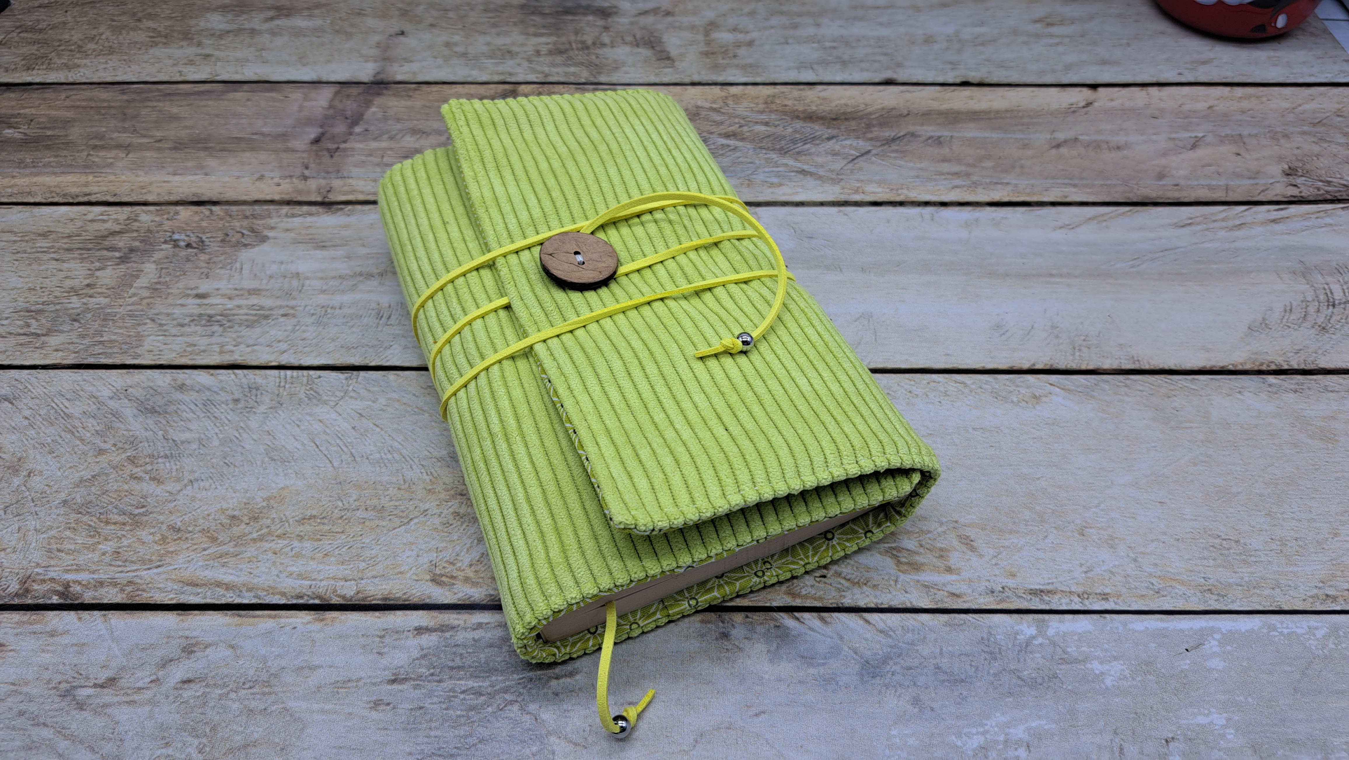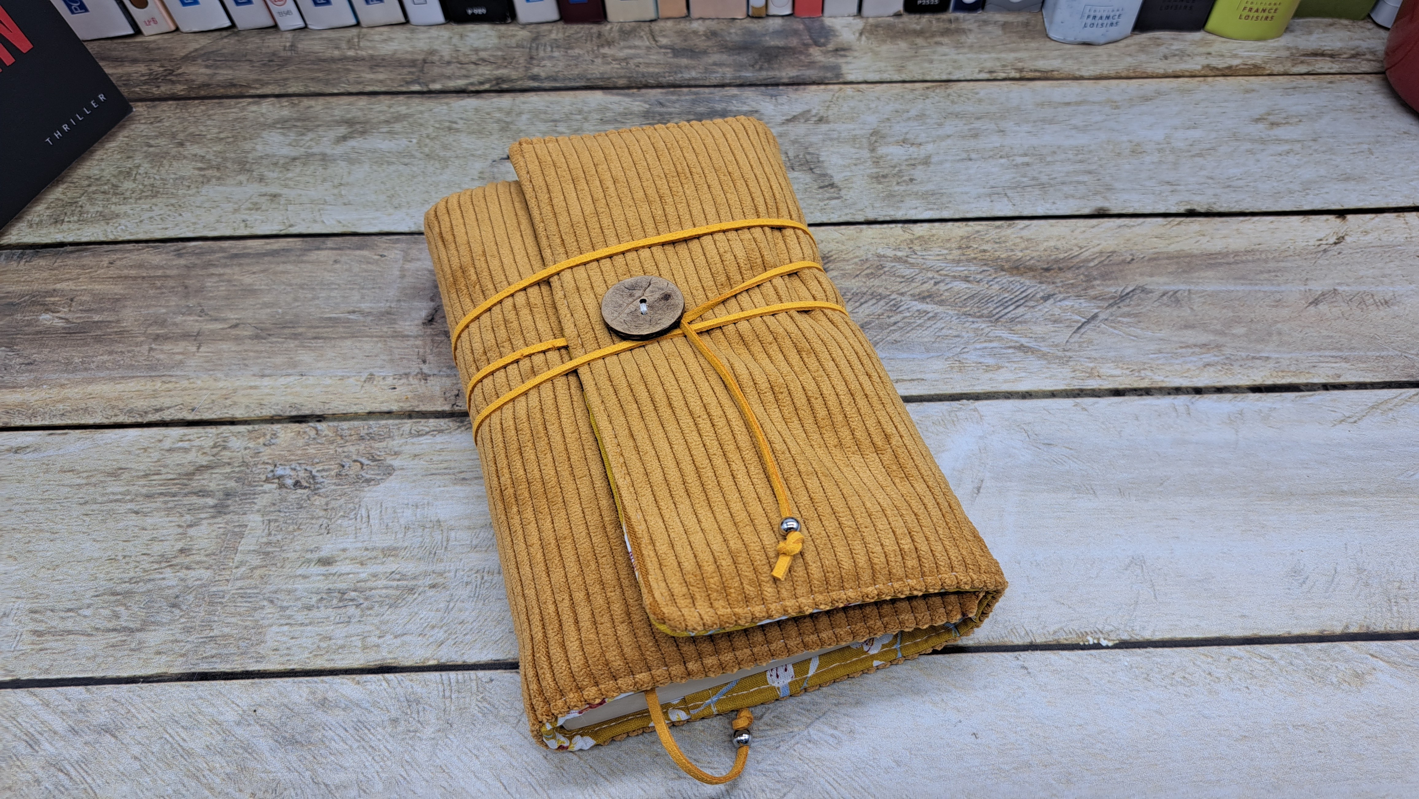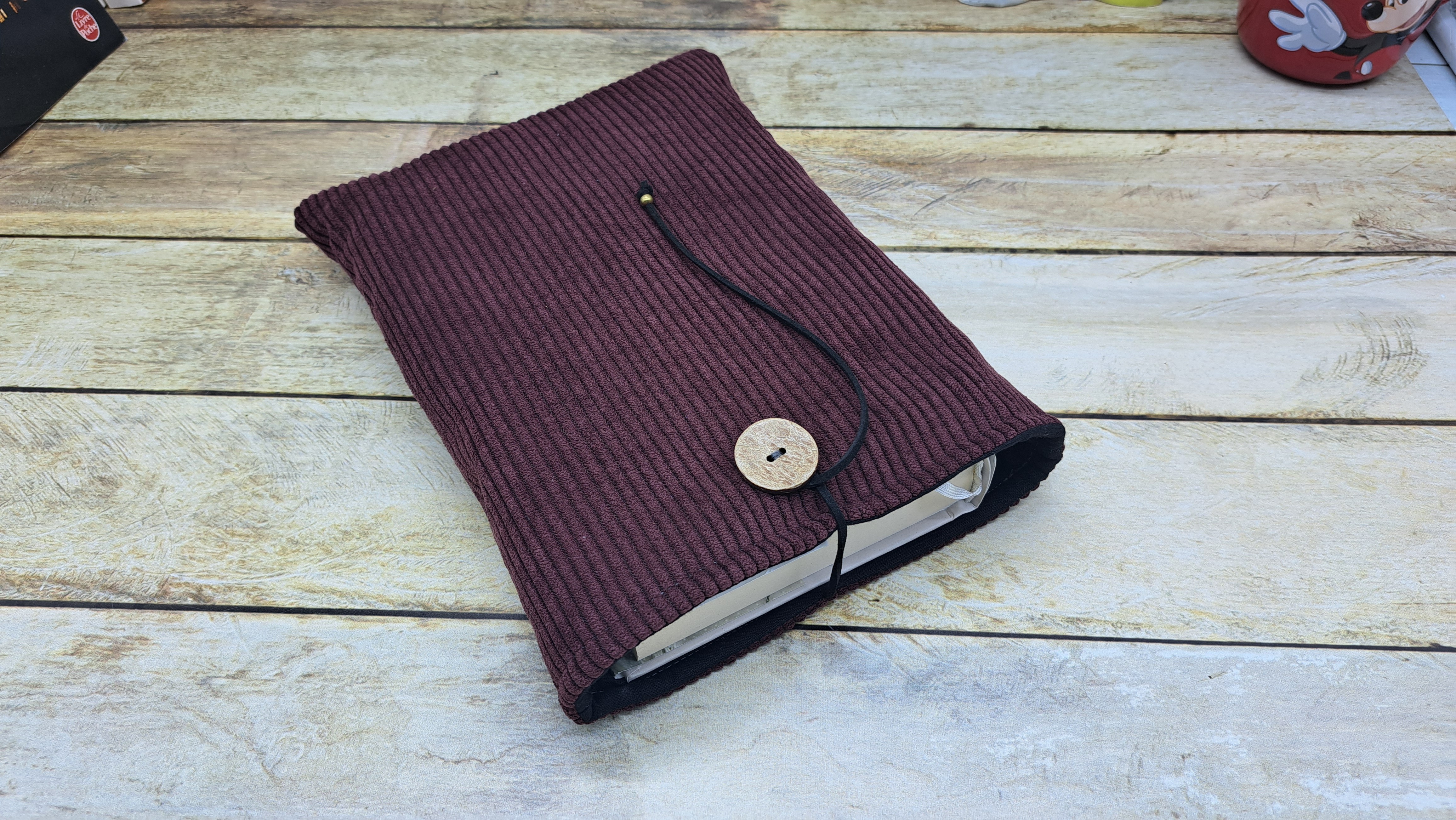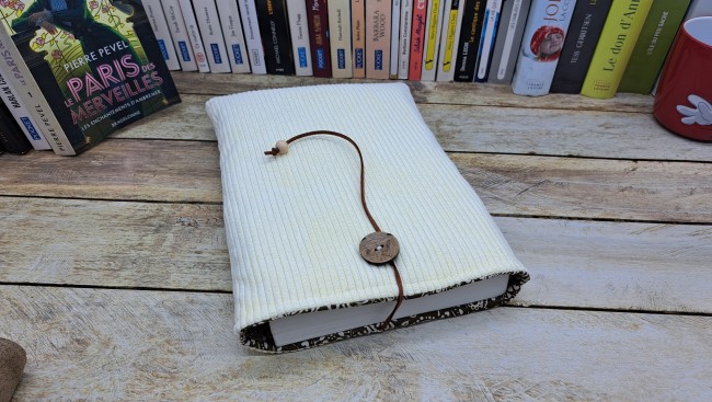 Protège livre en tissus coton velours se fermant avec un bouton / crochet et un cordon.