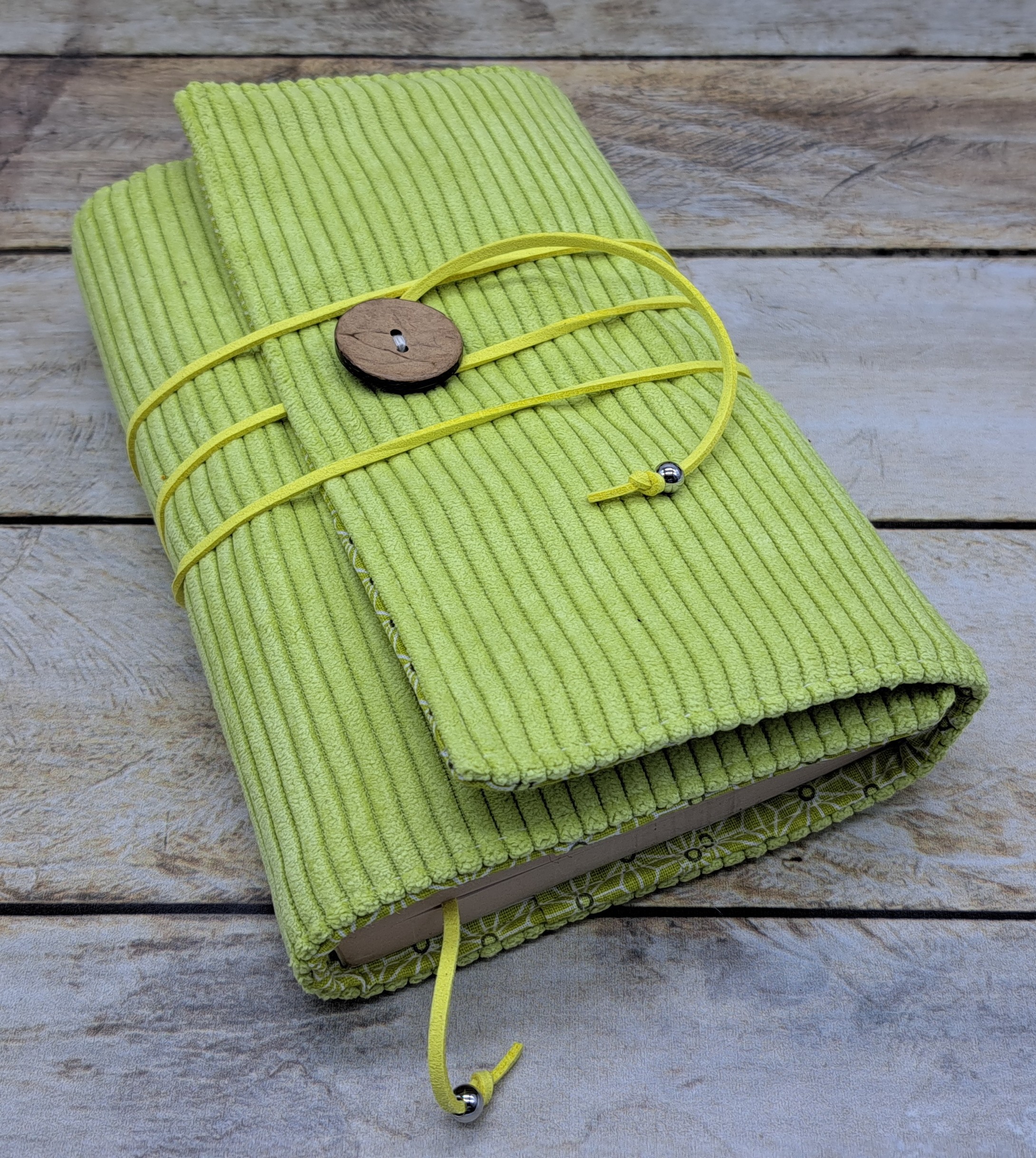 Protège livre en tissus velours se fermant avec un bouton et un cordon.