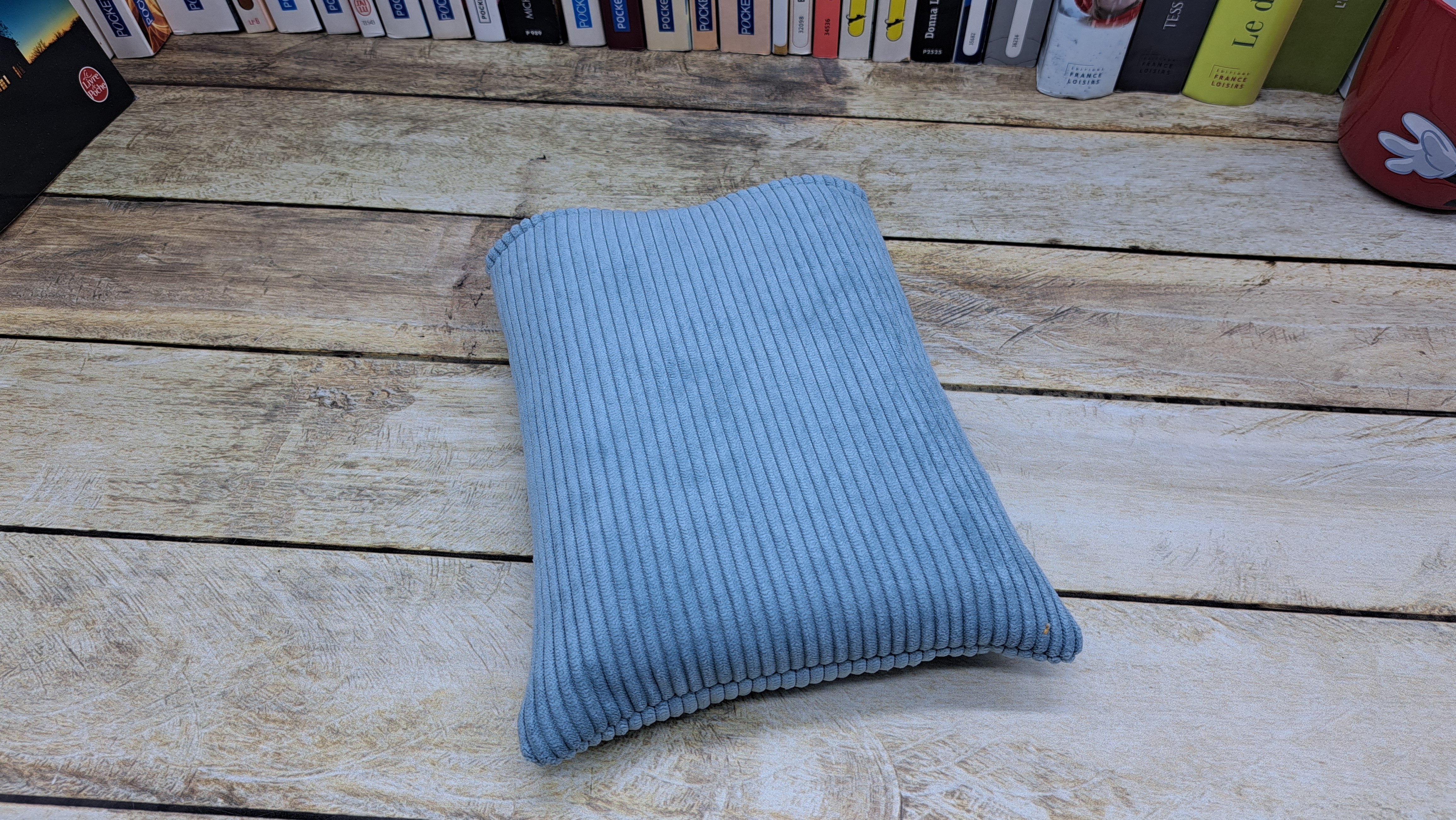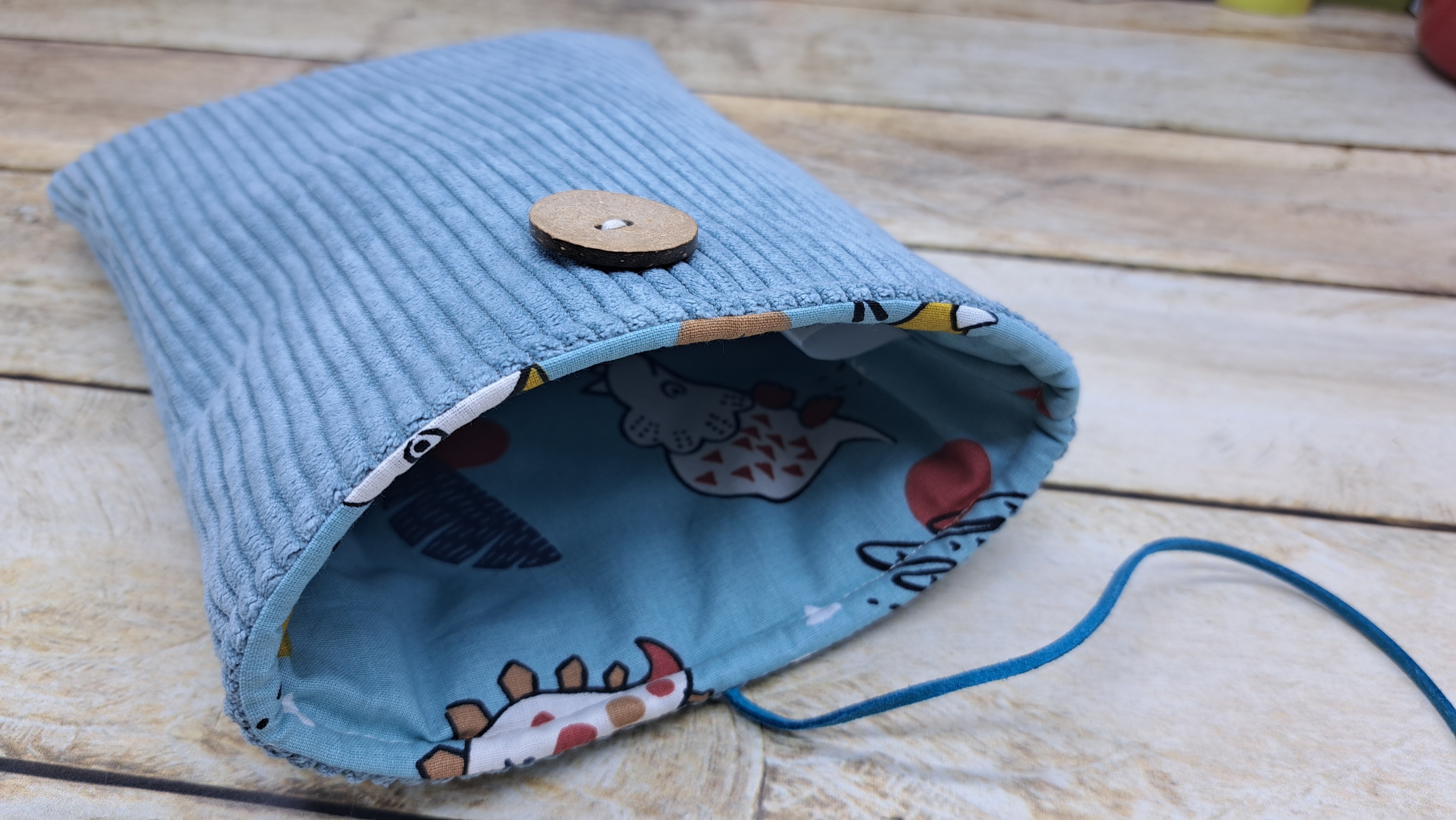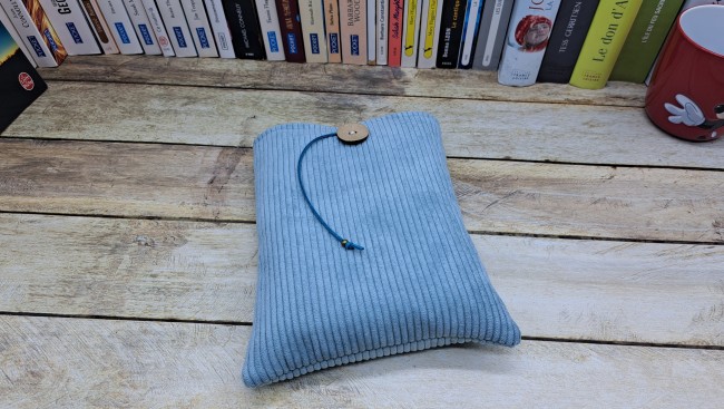 Housse de protection pour livre en tissu coton et velours molletonné se fermant avec un bouton et un cordon