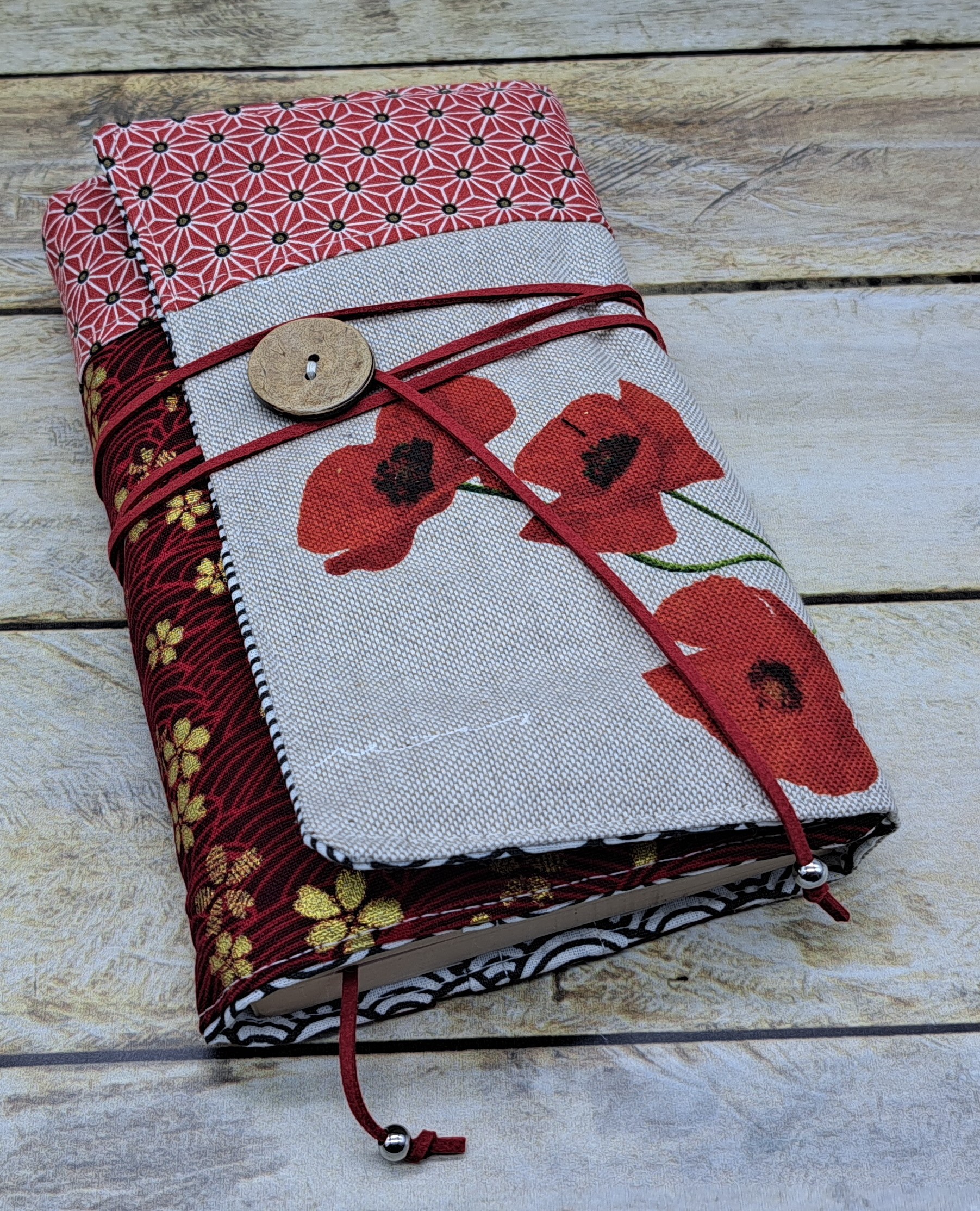 Protège livre en tissus coton patchwork se fermant avec un crochet / bouton et un cordon.