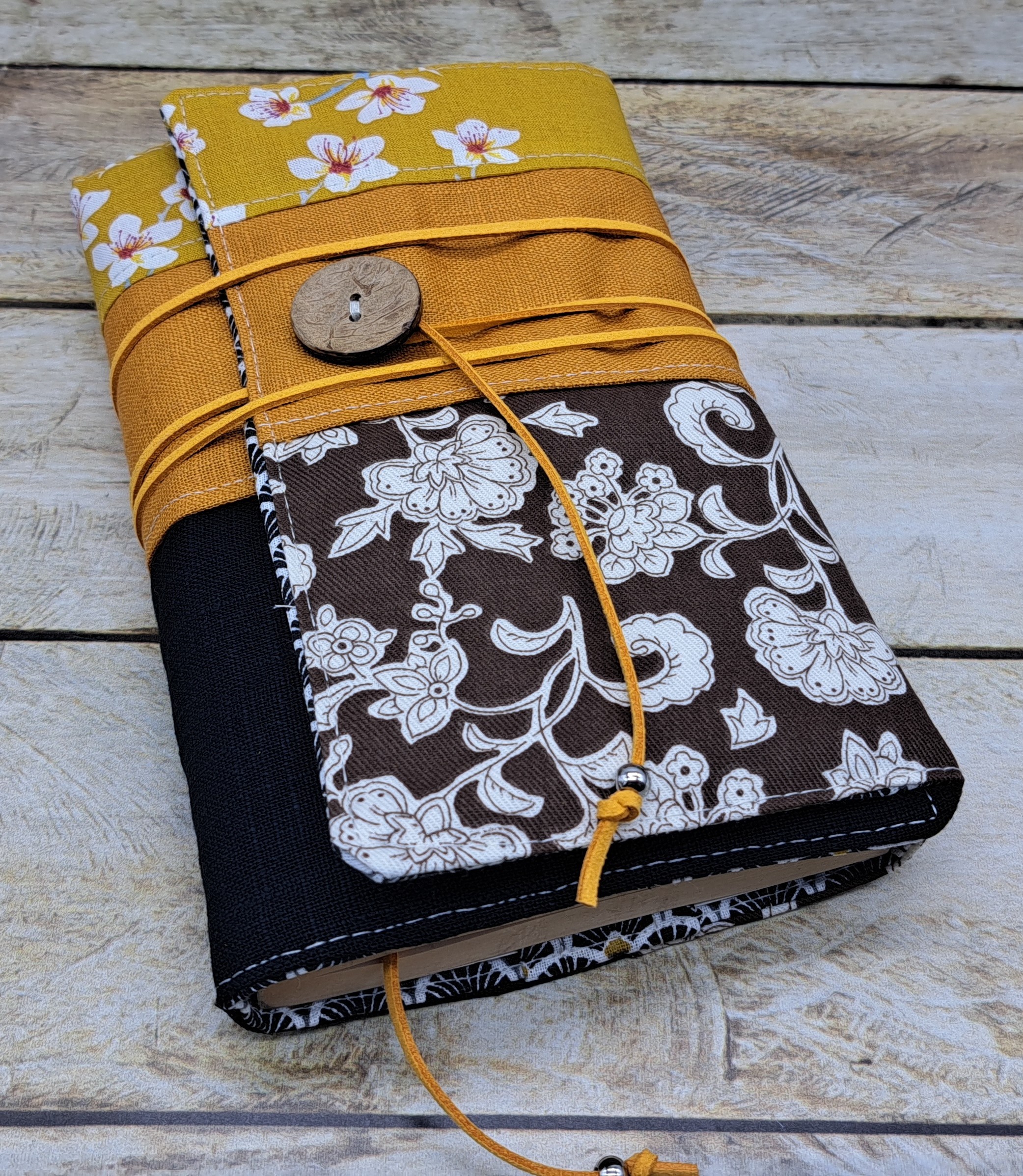 Protège livre en tissus coton patchwork se fermant avec un crochet / bouton et un cordon.