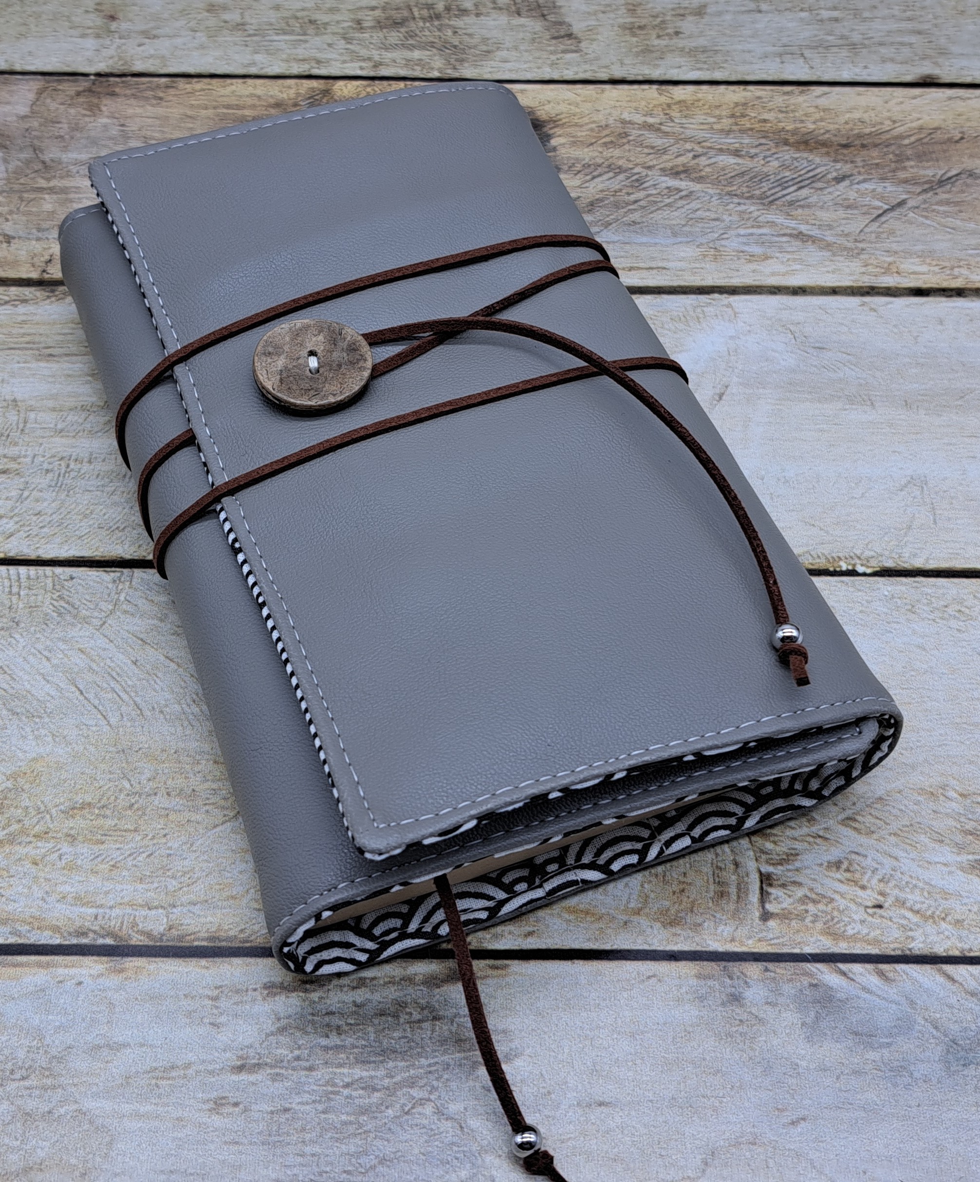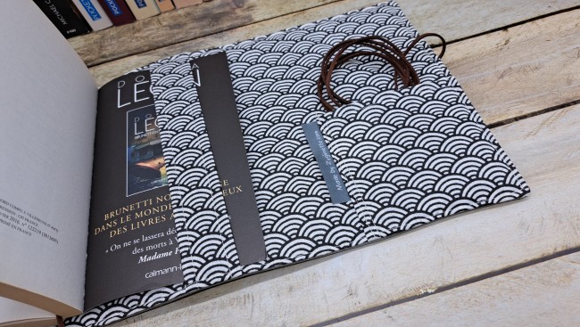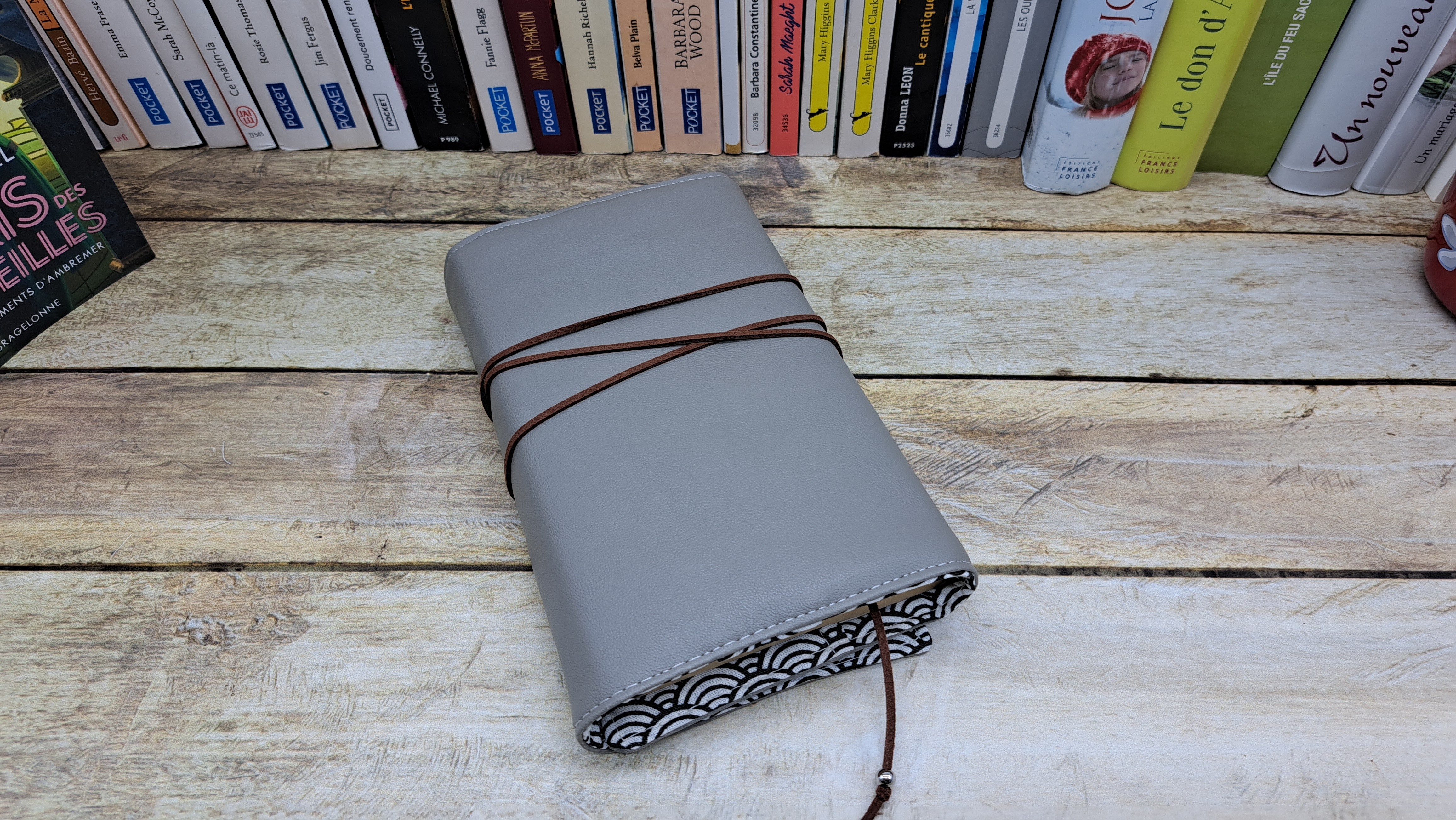 Protège livre en tissus simili cuir et coton se fermant avec un bouton et un cordon.