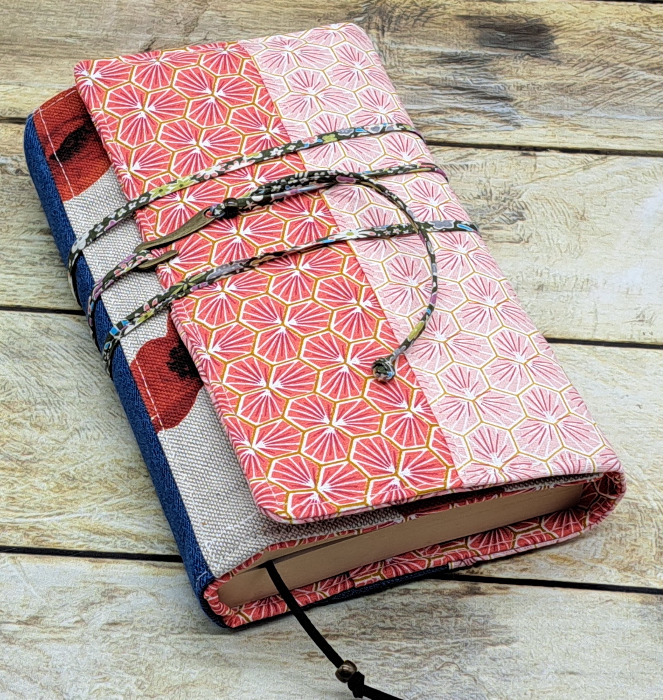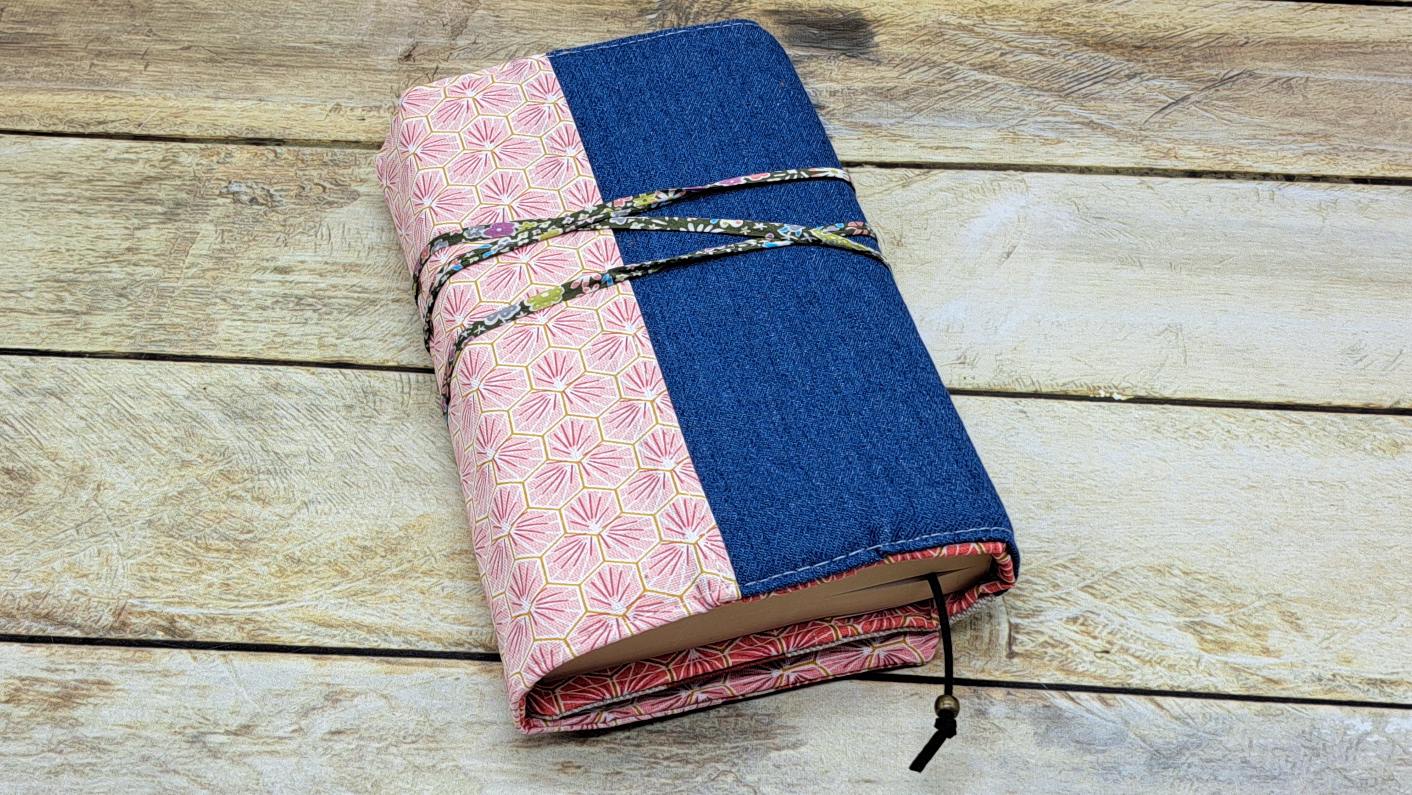 Protège livre en tissus coton patchwork se fermant avec un crochet / bouton et un cordon.