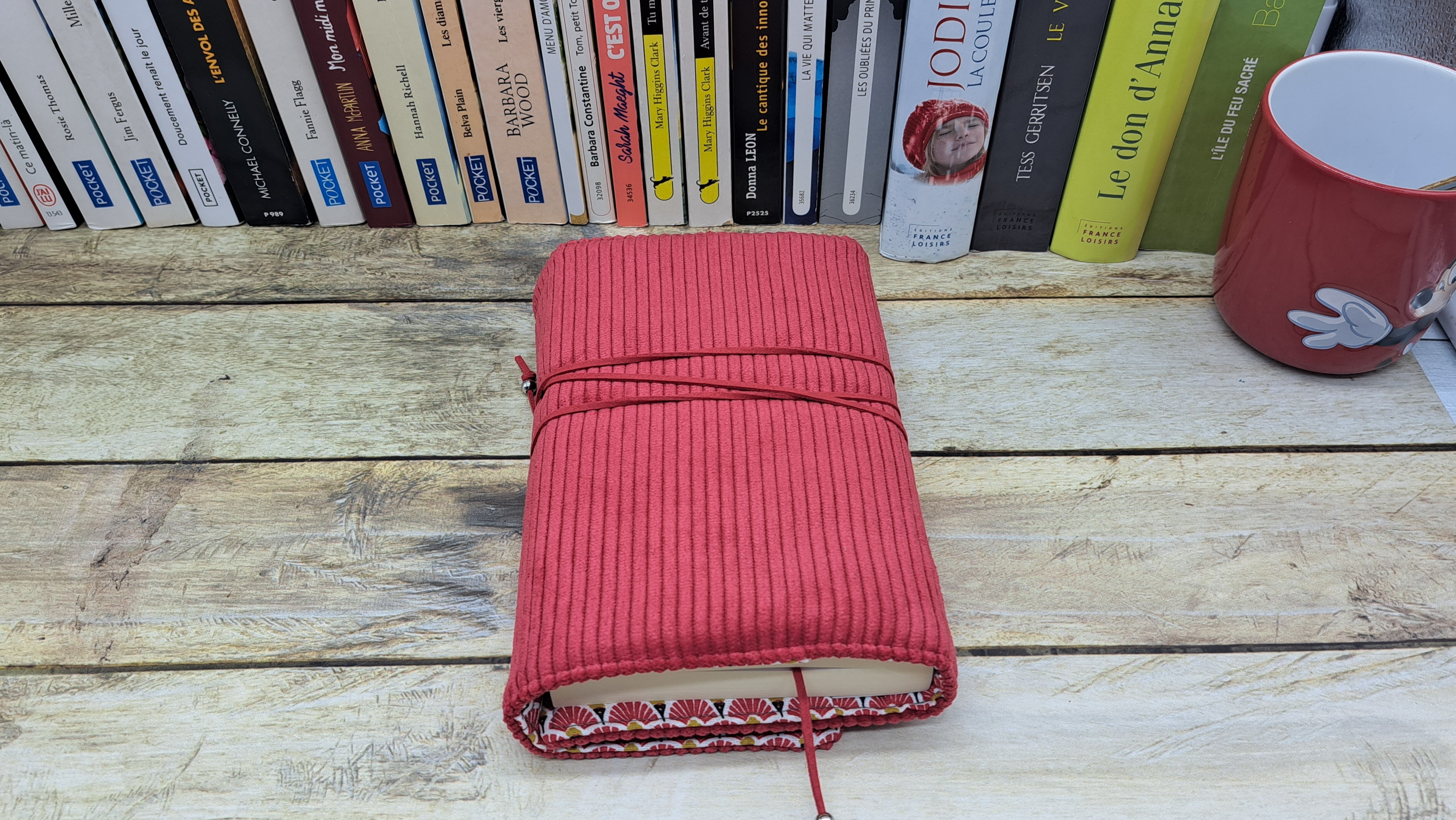 Protège livre en tissus coton velours se fermant avec un bouton et un cordon.