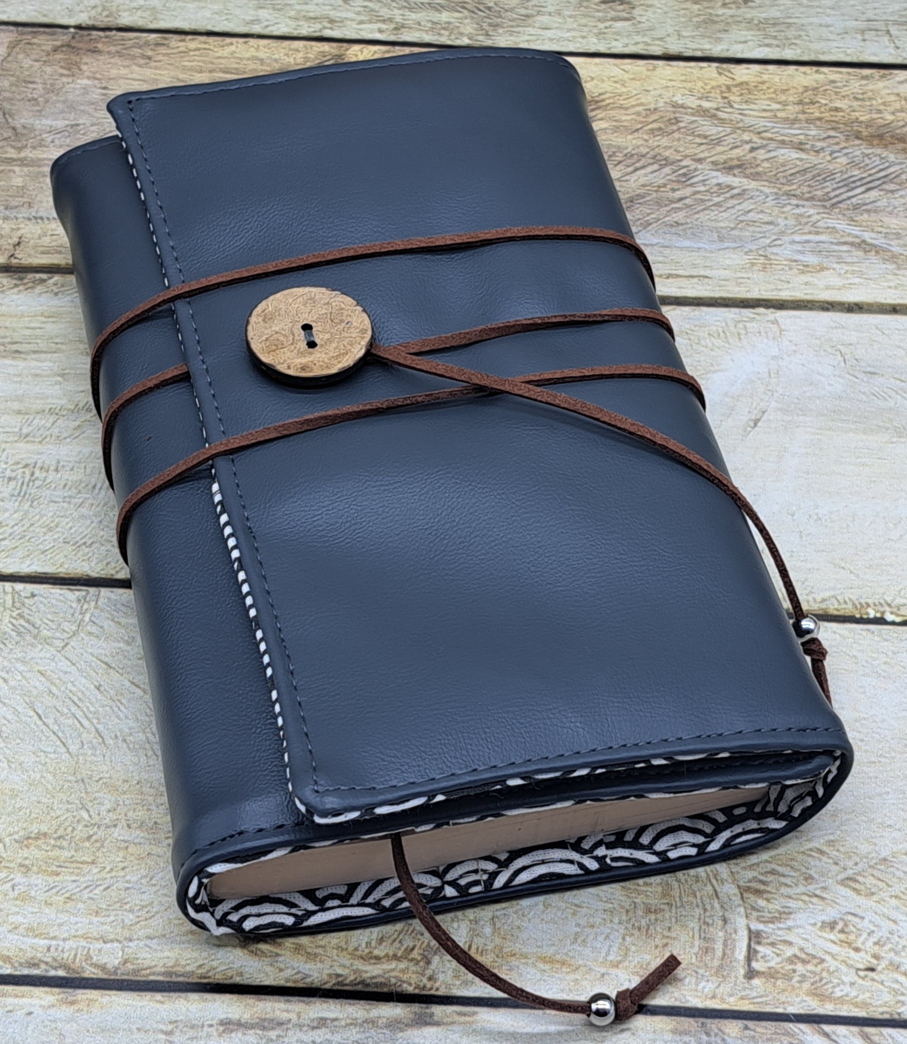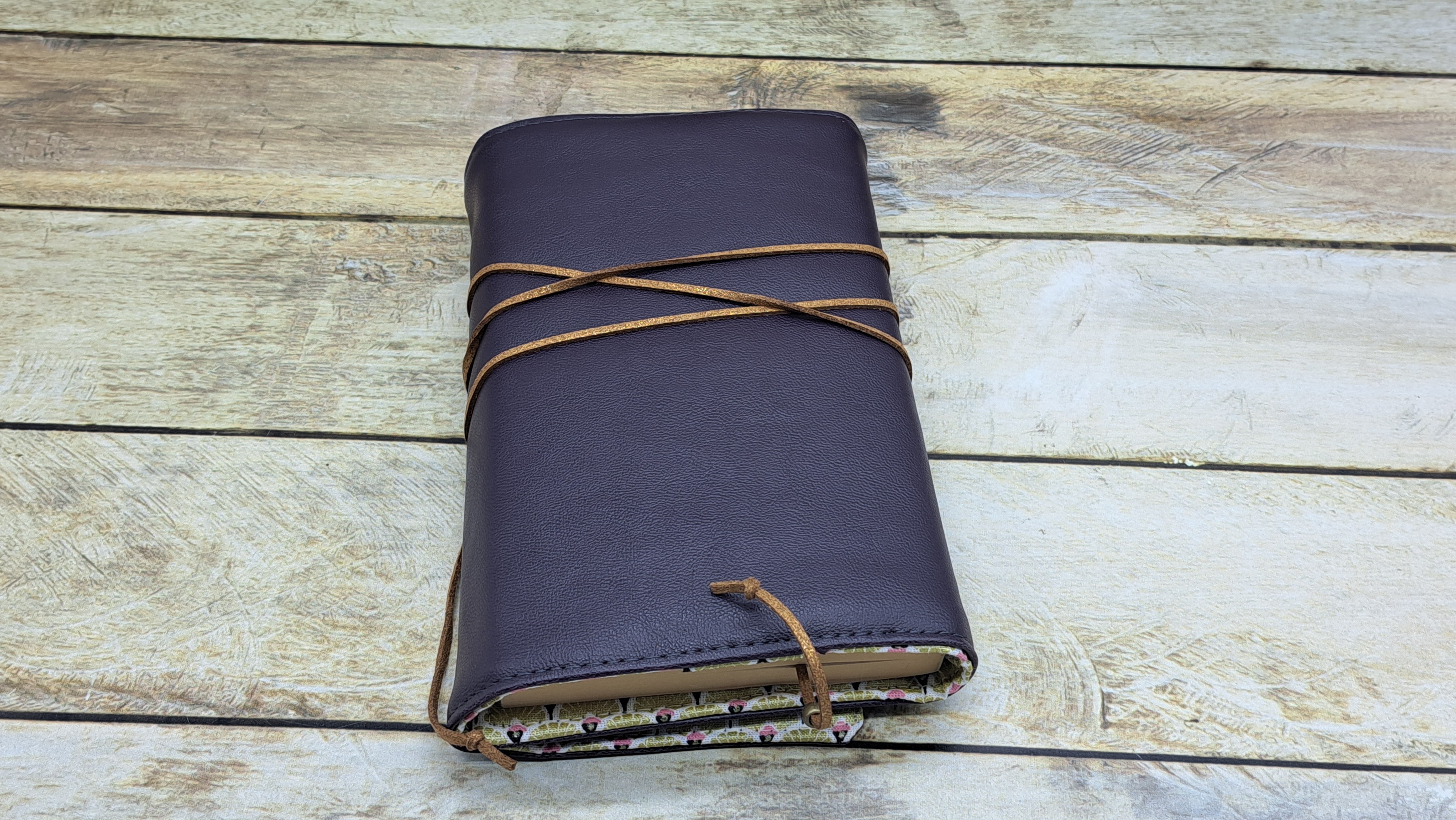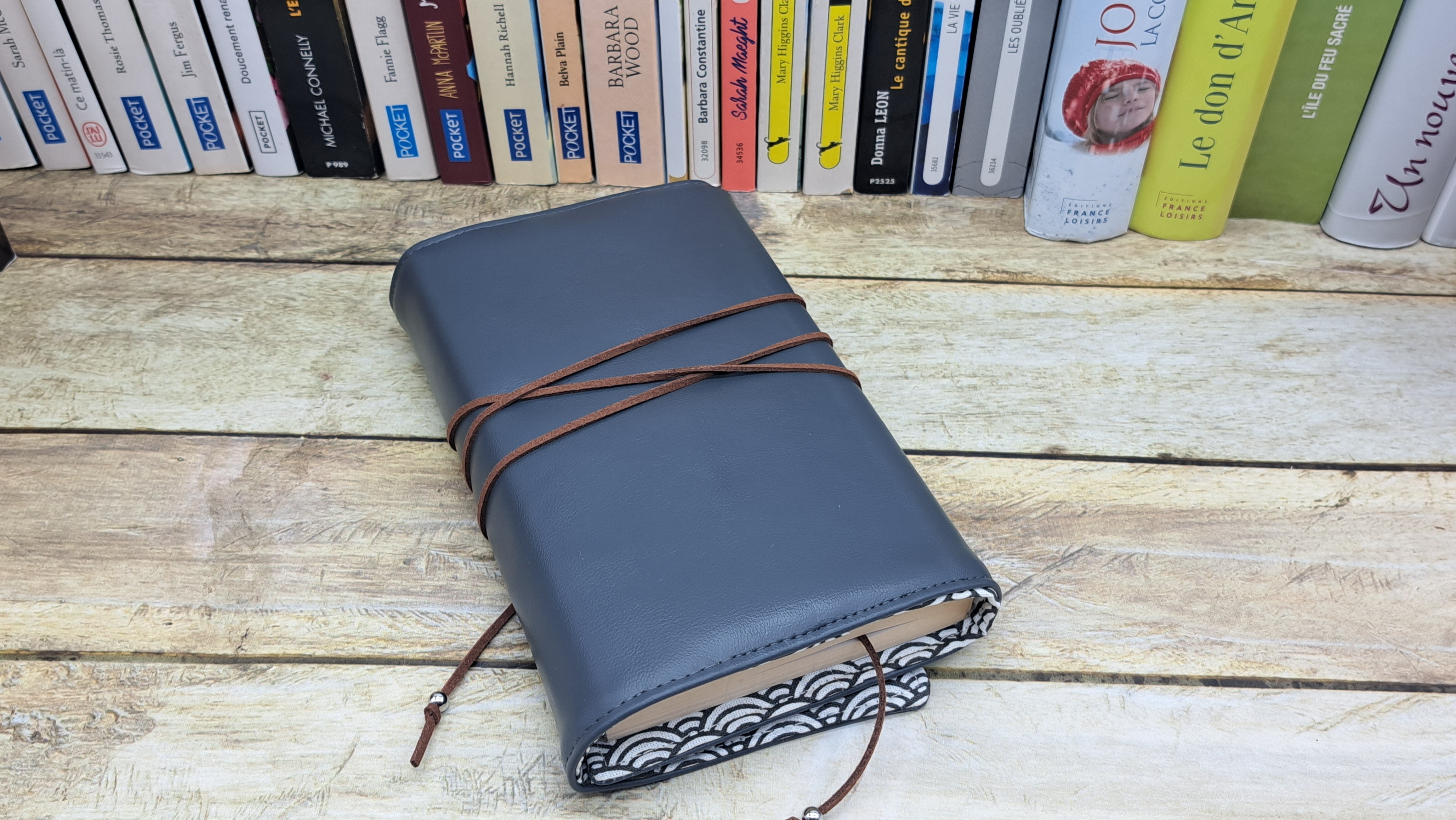 Protège livre en tissus simili cuir et coton se fermant avec un bouton et un cordon.