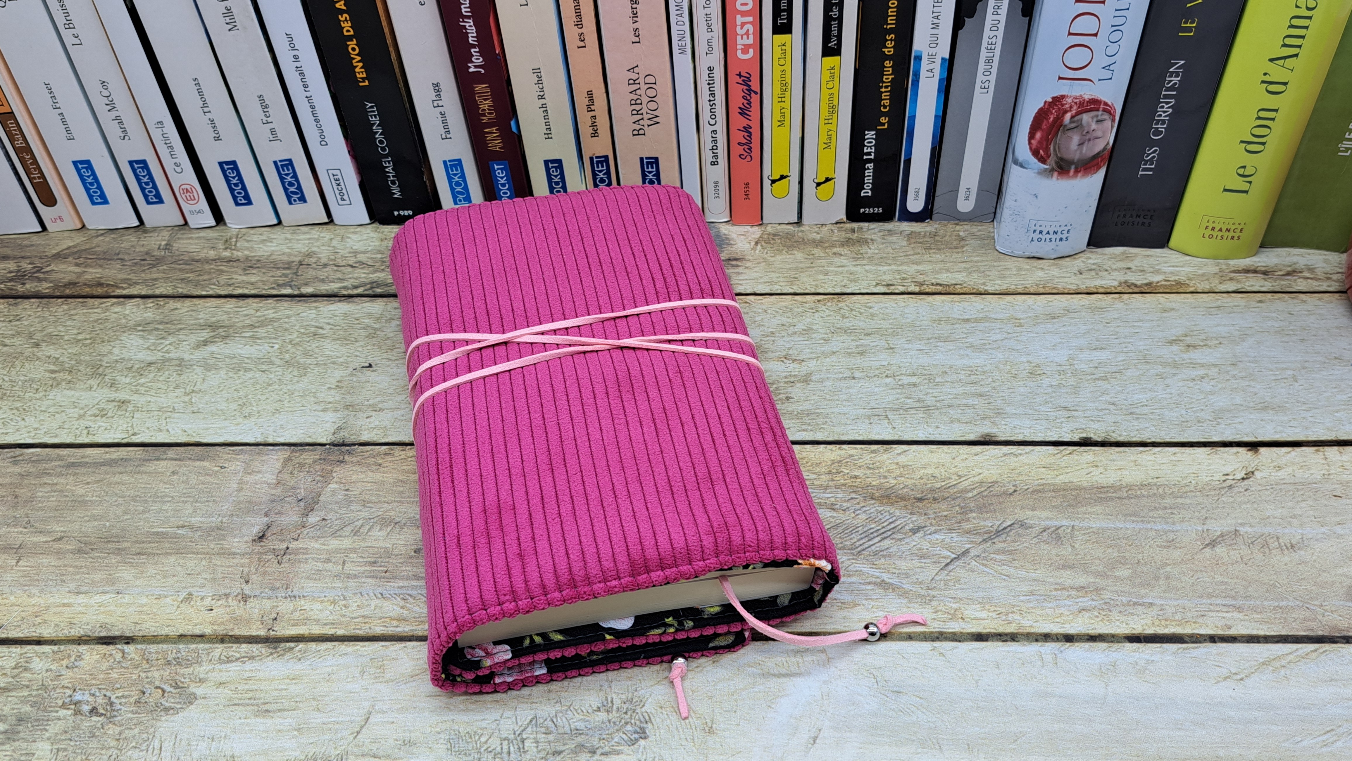 Protège livre en tissus coton velours se fermant avec un bouton et un cordon.