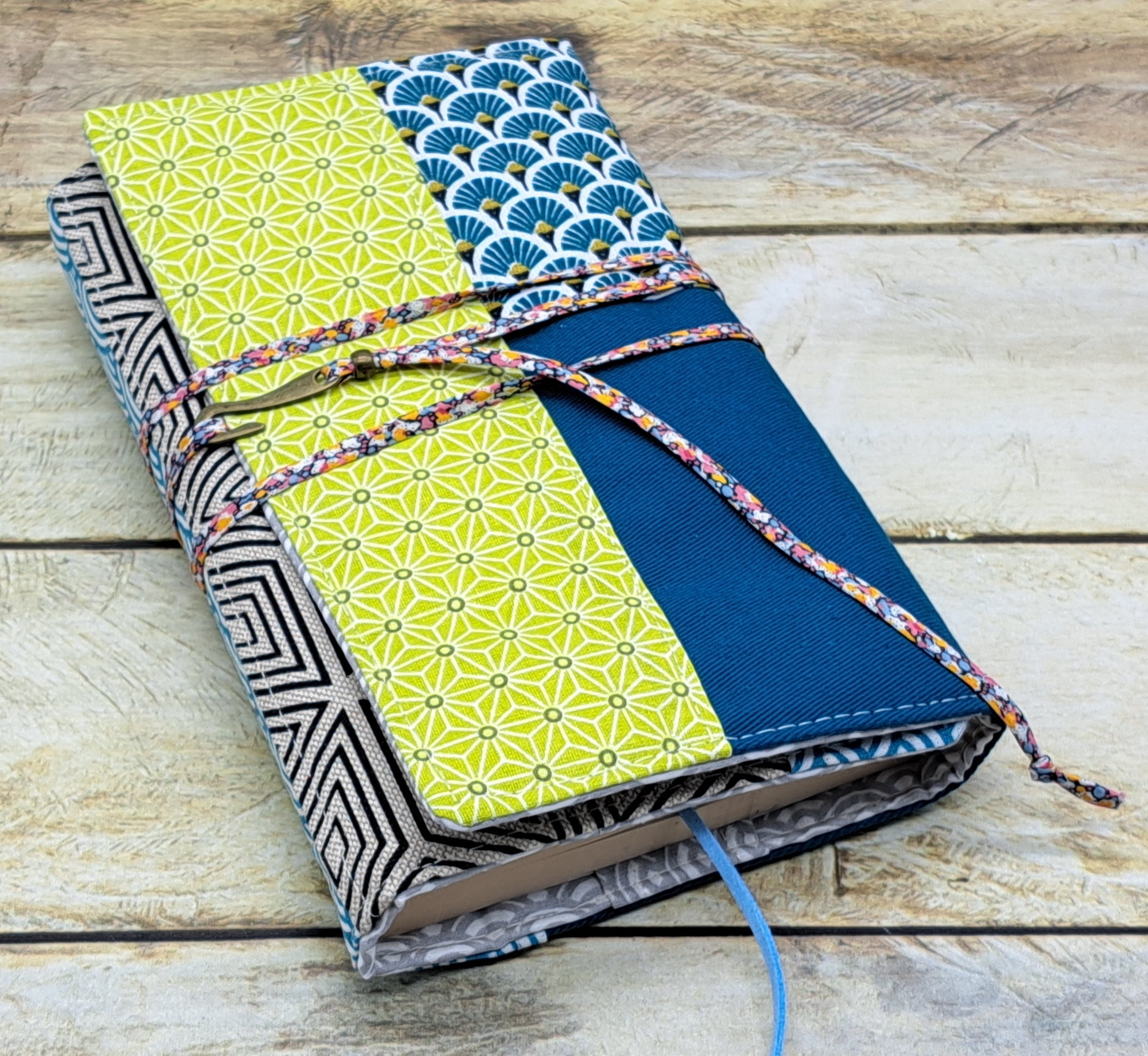 Protège livre en tissus coton patchwork se fermant avec un crochet / bouton et un cordon.